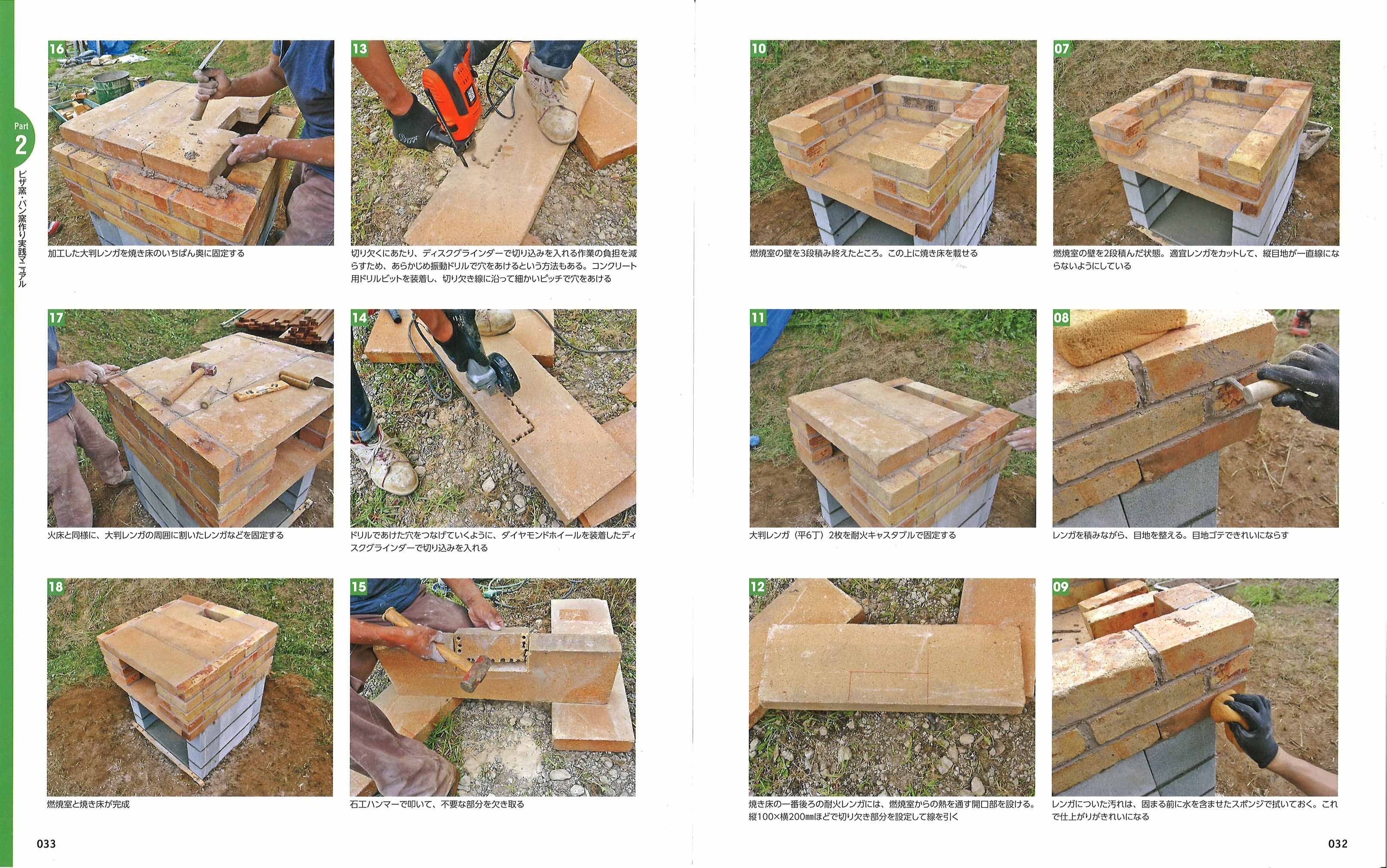 実際に編集部でレンガをつかって製作したピザ窯づくりのプロセスを詳細に写真入りで説明。レンガ加工のコツもバッチリ紹介。