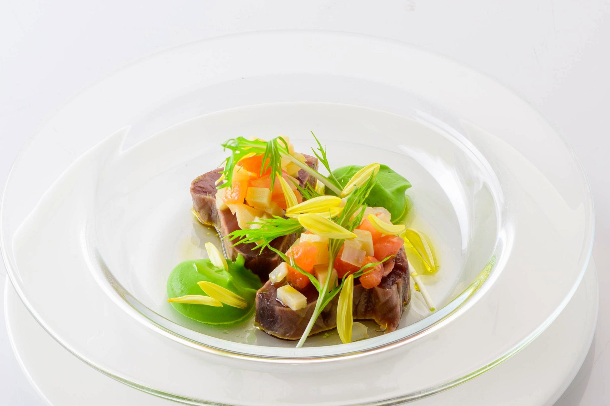 春鰹を大きめにスライスし、まろやかな甘みがあるグリーンピースソースとともにお召し上がりください。