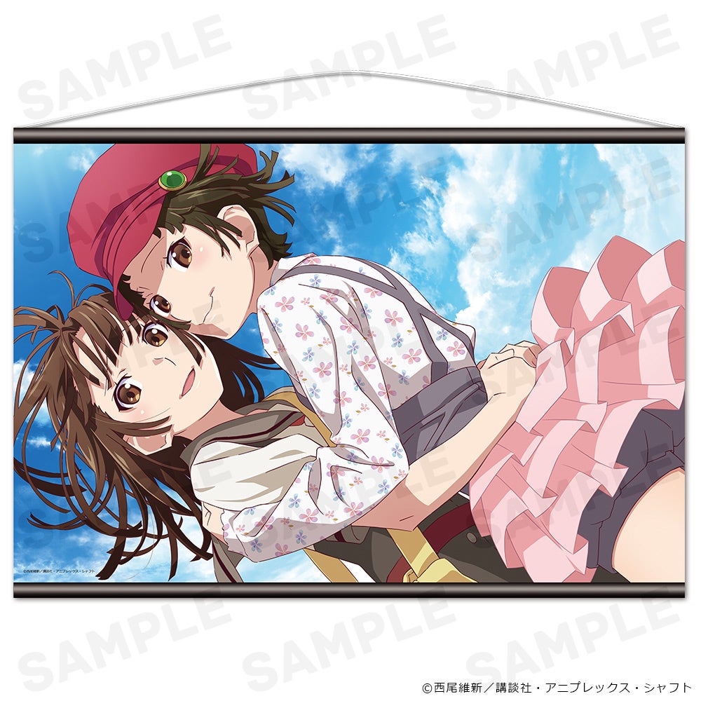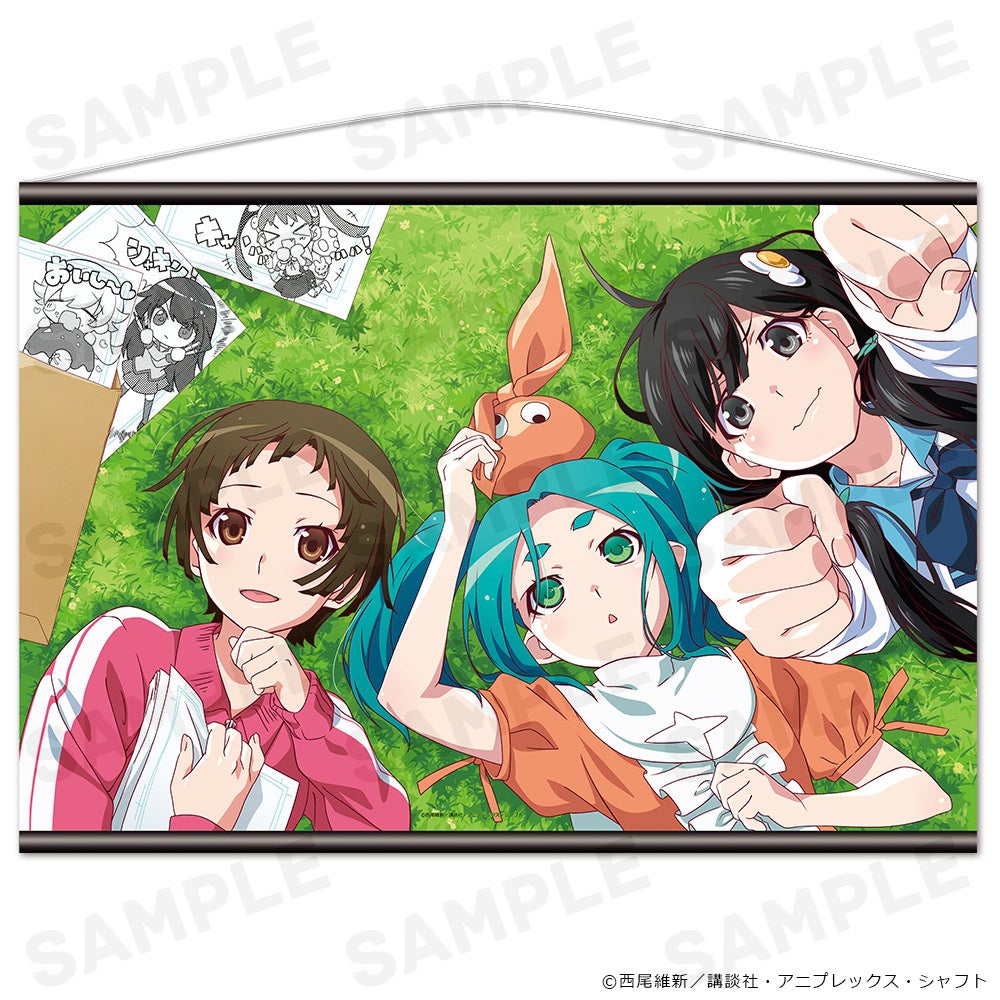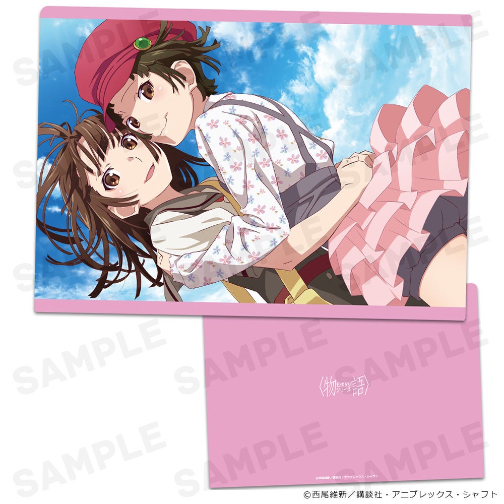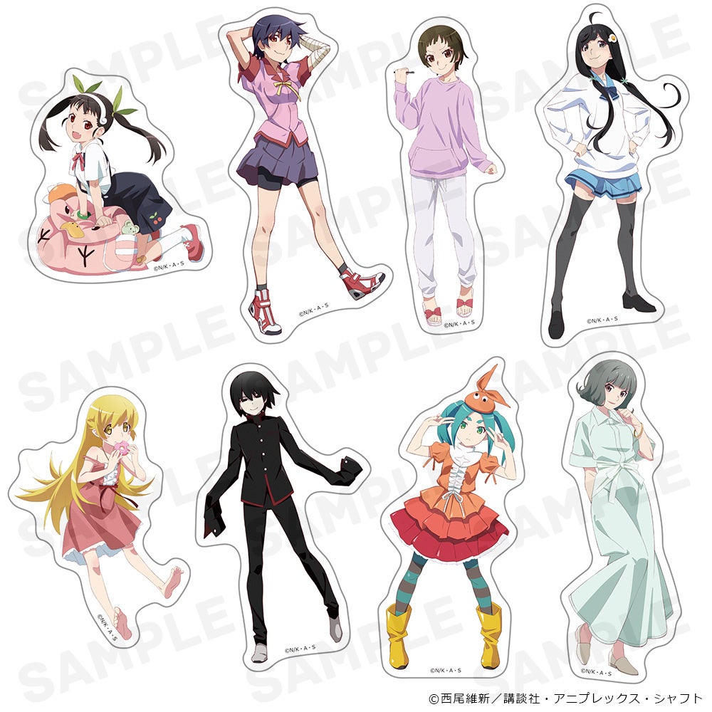 <物語>シリーズ リブ付ロングスリーブTシャツ、Tシャツ、B2タペストリー、キャラクターラバーマット、アクリルキャラスタンド、缶バッジ4個セットなどの受注を開始しました!