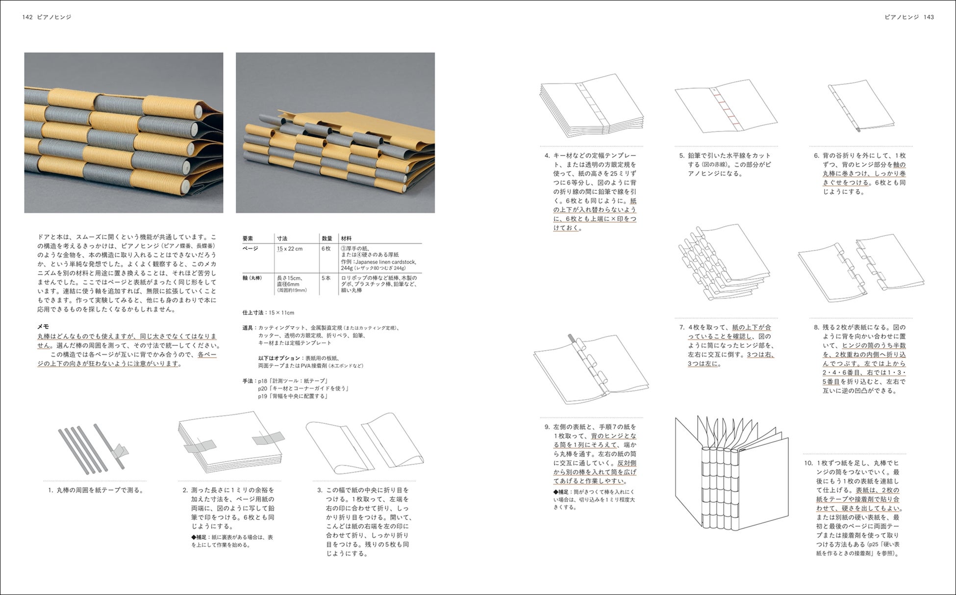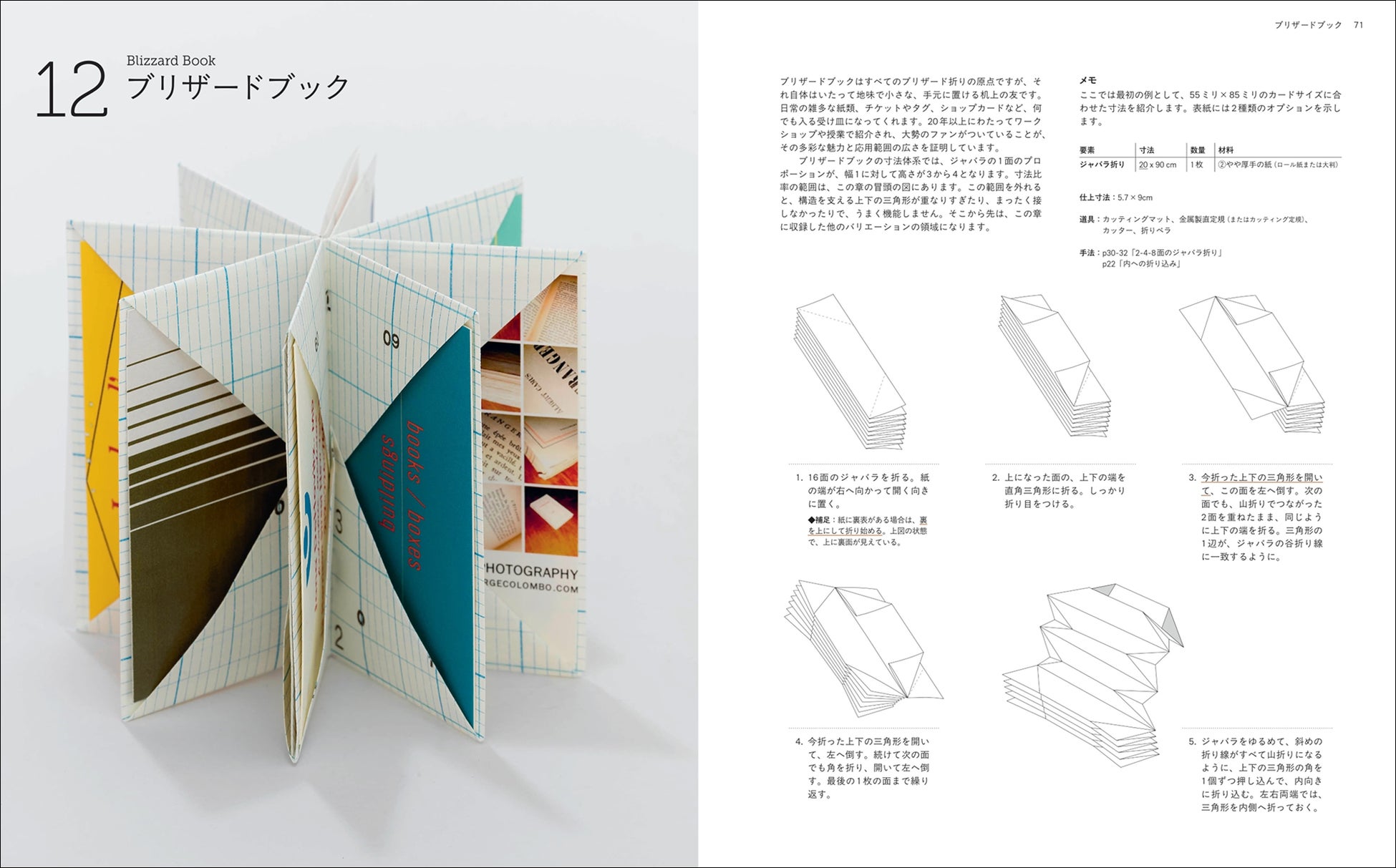 糸を使わずに1枚の紙で、星、風車、王冠、魚の骨、蜘蛛の形のようにも見える、美しい造形の本がつくれる一冊。「ジャバラ折り」「ブリザード折り」でつくれる物から、「1枚仕立ての本」「アルバムとスクラップブック」など、用途に合わせた物まで、つくりたいものが紙1枚で叶います。