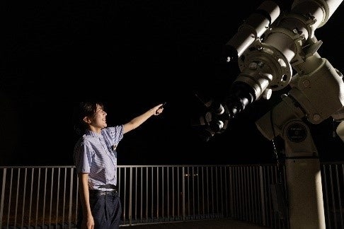 休暇村奥武蔵では、毎晩夕食後、館内屋上の「月と星のテラス」にて、宿泊者限定の星空観察プログラム「スタービューイング」を実施しています。星空に精通したスタッフが天体望遠鏡を用いてご案内する、本格的な星空体験です。