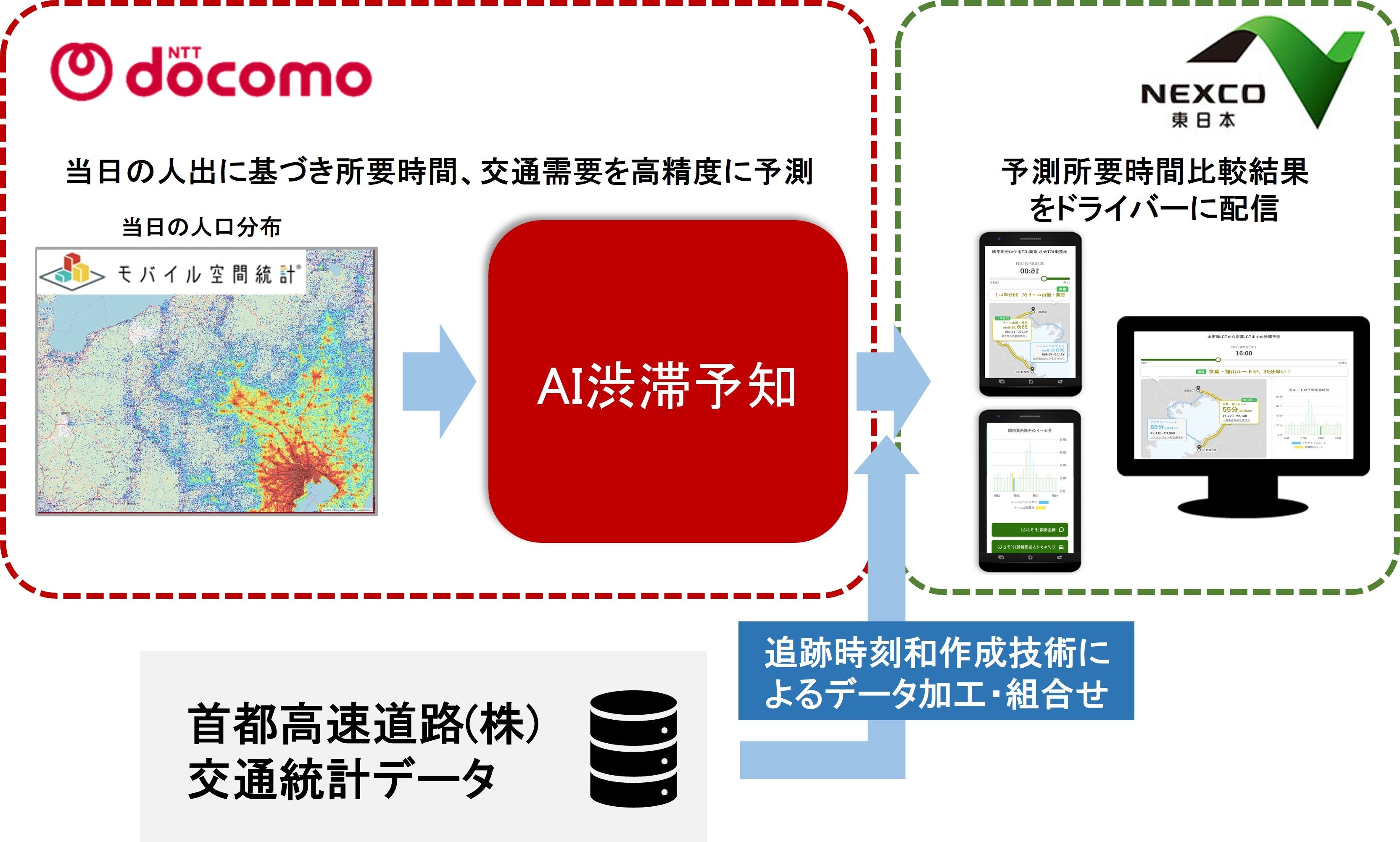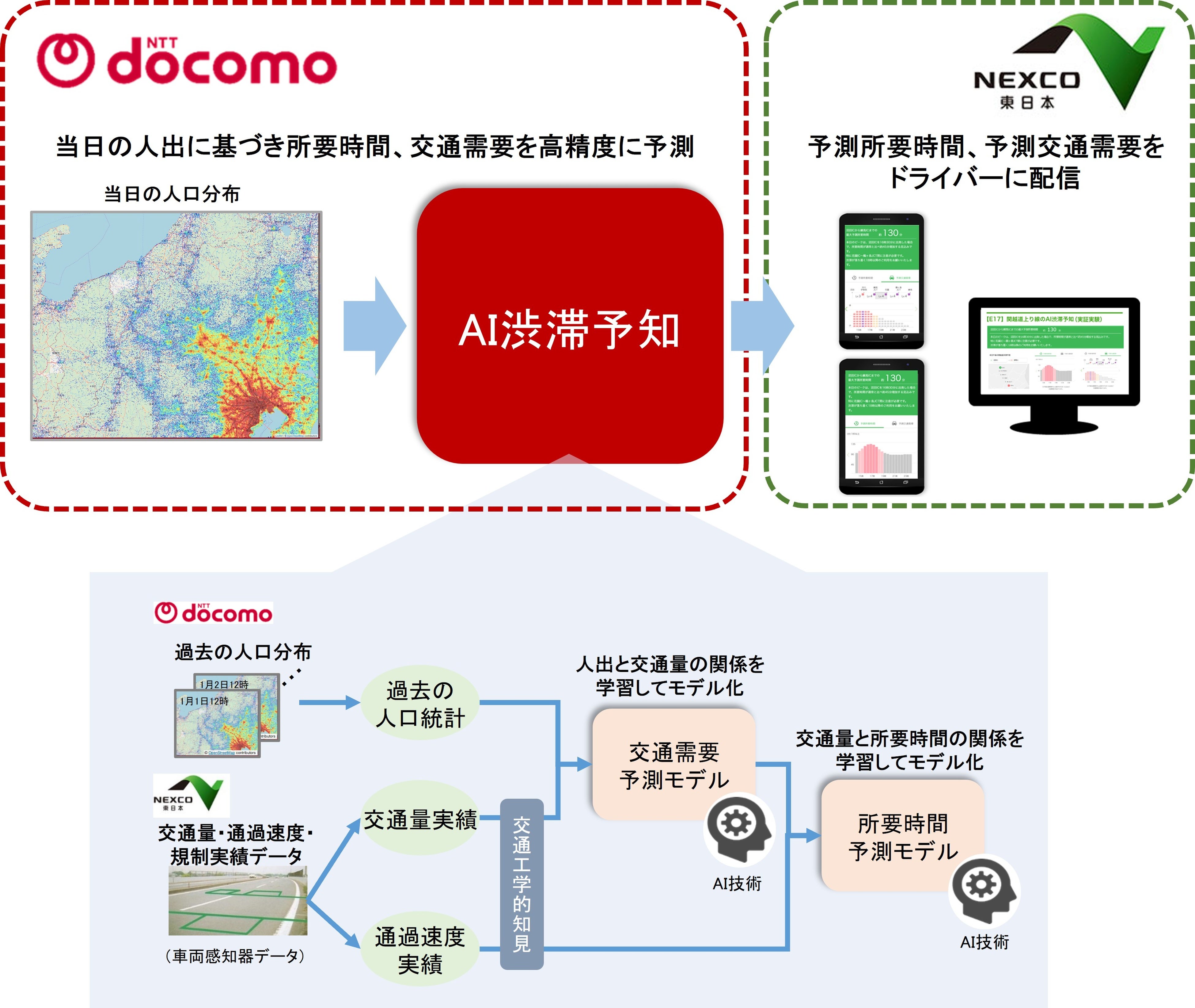 ドコモが持つ携帯電話ネットワークの仕組みを利用して作成されるリアルタイム版モバイル空間統計※1(以下、人口統計)と、NEXCO東日本が保有する過去の交通量・渋滞・規制などの実績データをもとにドコモが開発 した「AI渋滞予知」技術、さらにNEXCO東日本の交通工学的知見・ノウハウを掛け合わせることで、当日の人出から所要時間や交通需要※2を予測しドライバーに配信しています。