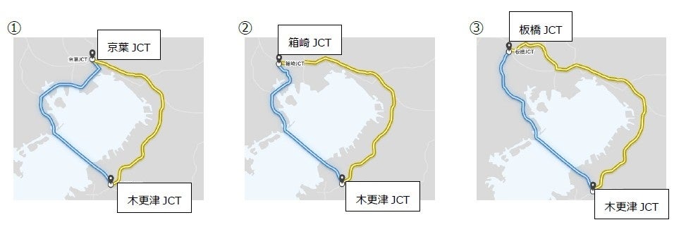 房総から首都高管内の道路を経由して都心方向へ向かうお客さまが最適なルートを選択できるように、アクアラインルートと京葉・館山ルートから多くのお客様が利用される目的地として、下記3つの経路を選定しました。