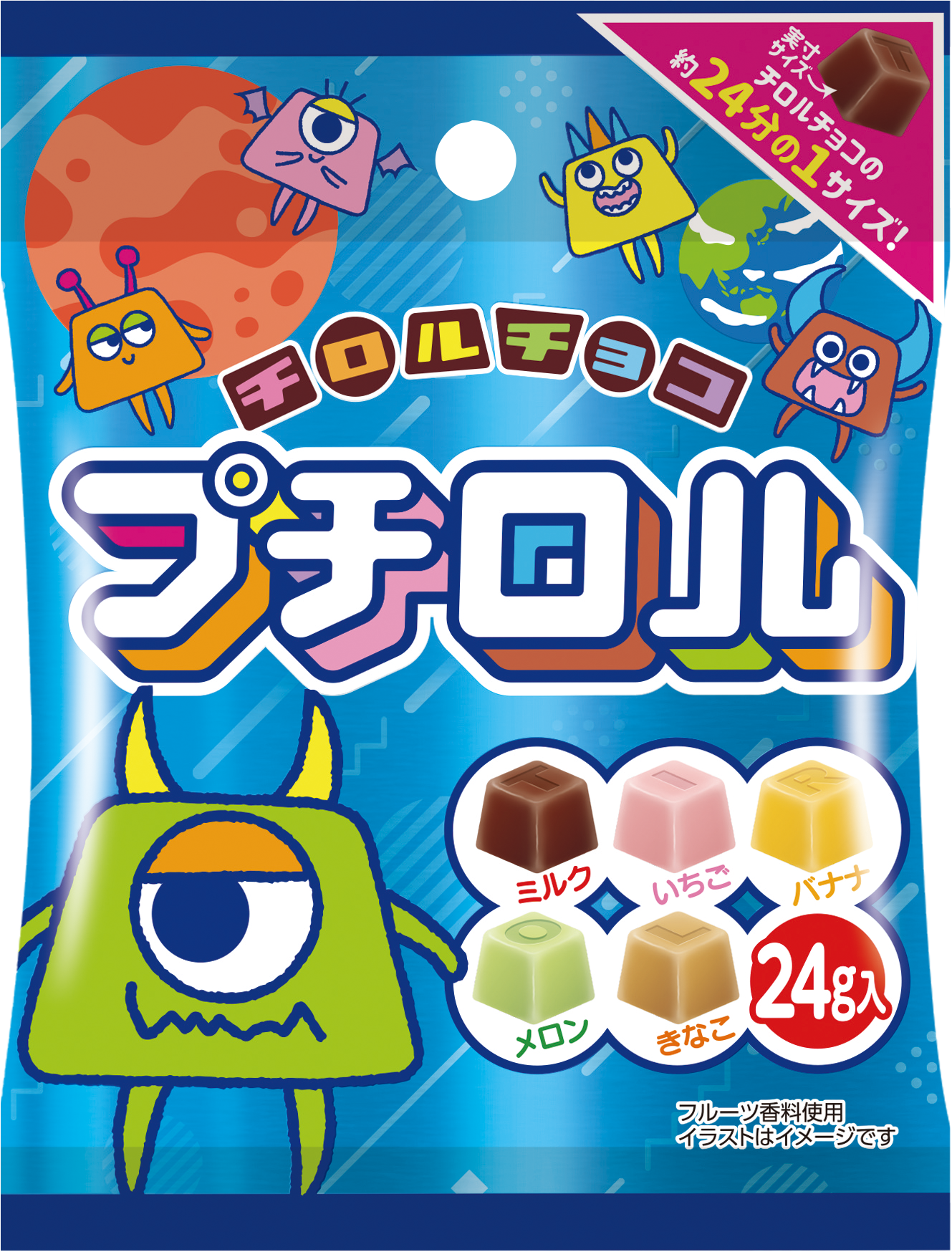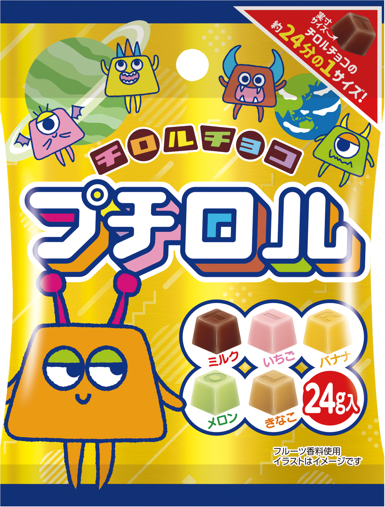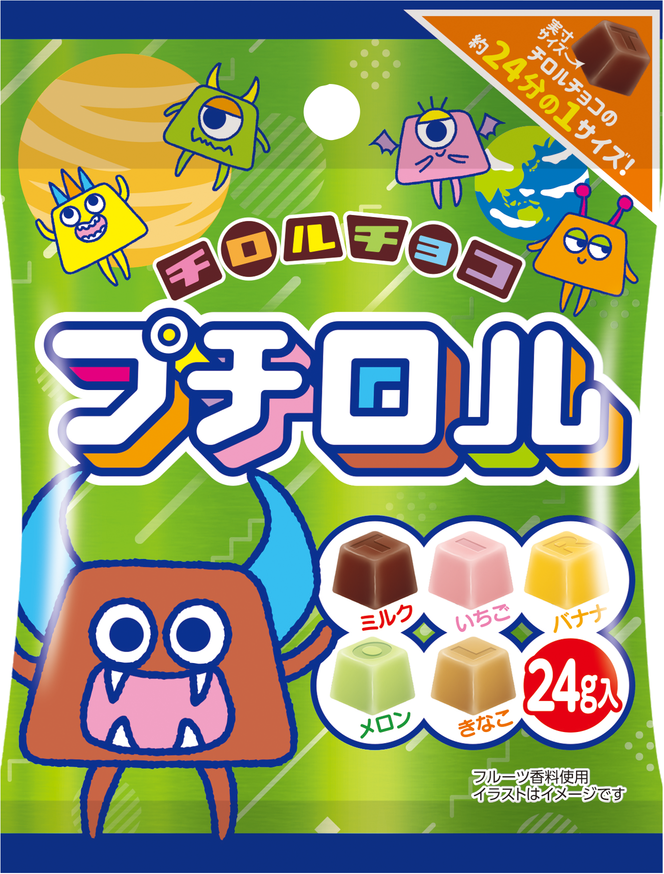 通常のチロルチョコ24分の1サイズ「プチロル」は、ミルク・いちご・バナナ・きなこ・メロンの5つの味が楽しめます。