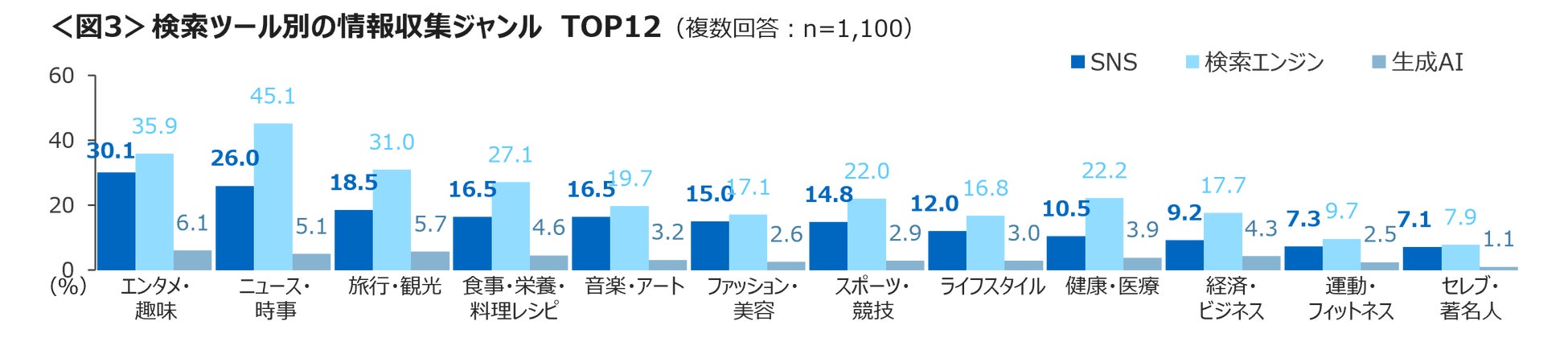 SNSと検索エンジンで差が少なかったものは「音楽・アート」「ファッション・美容」「運動・フィットネス」「セレブ・著名人」。<図3>