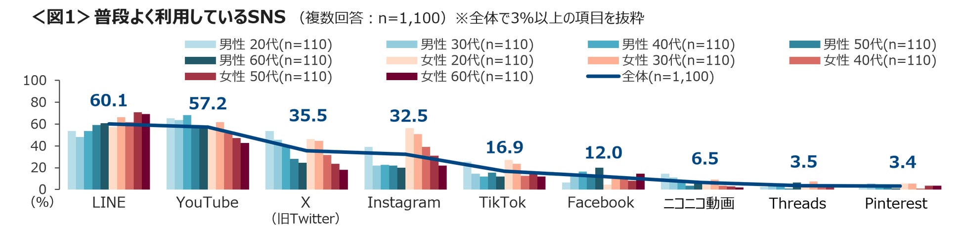 「LINE」は年齢が上がるほど、「YouTube」「X」は年齢が若いほど利用率が高い傾向。「Instagram」は女性で高く、特に20~40代でよく利用している。<図1>