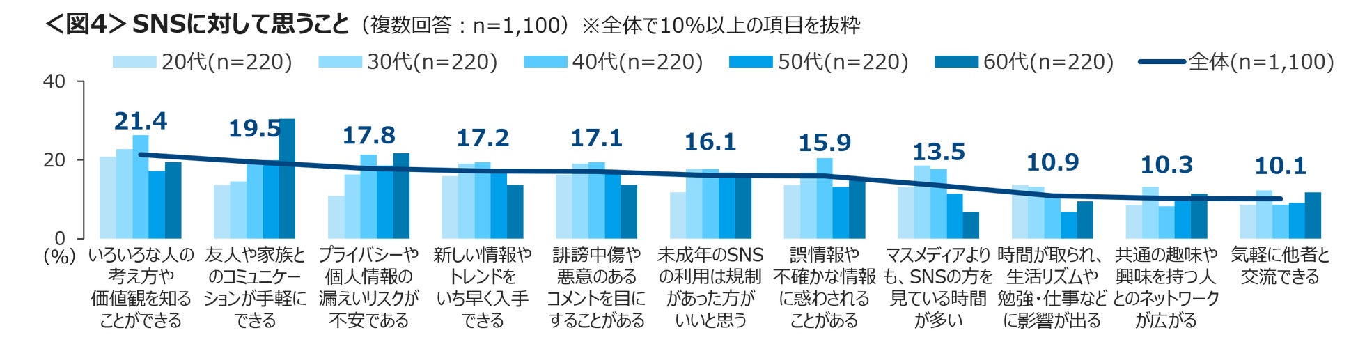 「友人や家族とのコミュニケーションが手軽にできる」は年代が上がるほど、割合が高くなっている。<図4>