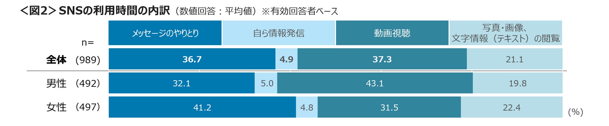 SNSの利用時間の内訳は、「動画視聴」「メッセージのやりとり」がそれぞれ3割後半を占めた。「自ら情報発信」は4.9%と少ない。
