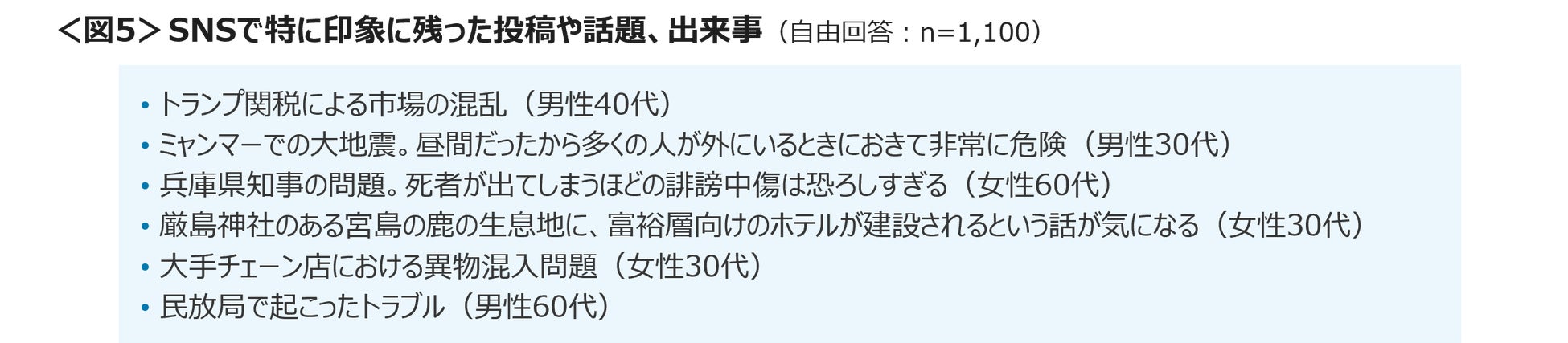 SNSで印象に残った話題は、トランプ関税やミャンマー大地震、大手企業での不祥事など、ニュース・時事ネタがあげられた。<図5>