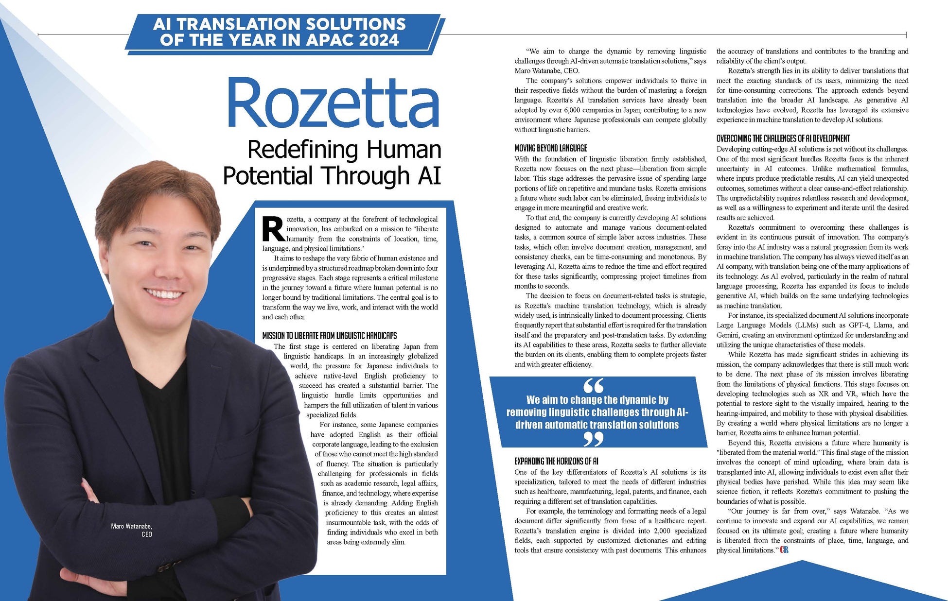 株式会社メタリアル(本社:東京都千代田区、代表取締役:五石 順一)グループで、国内市場No.1*のAI翻訳サービスを開発・提供する株式会社ロゼッタ(代表取締役:渡邊 麻呂)は、アジア太平洋地域で発行しているIT専門誌「CIOReview APAC」主催のAwardにおいて、「アジア太平洋地域のAI翻訳ソリューション・オブ・ザ・イヤー2024」を受賞いたしました。この賞は、同誌がアジア太平洋地域における、最優秀AI翻訳ソリューション企業を表彰するものです。この受賞とともに、国内最先端AI市場においての当社のこれまでの取り組みや未来への展望を紹介する特集記事が掲載されました。