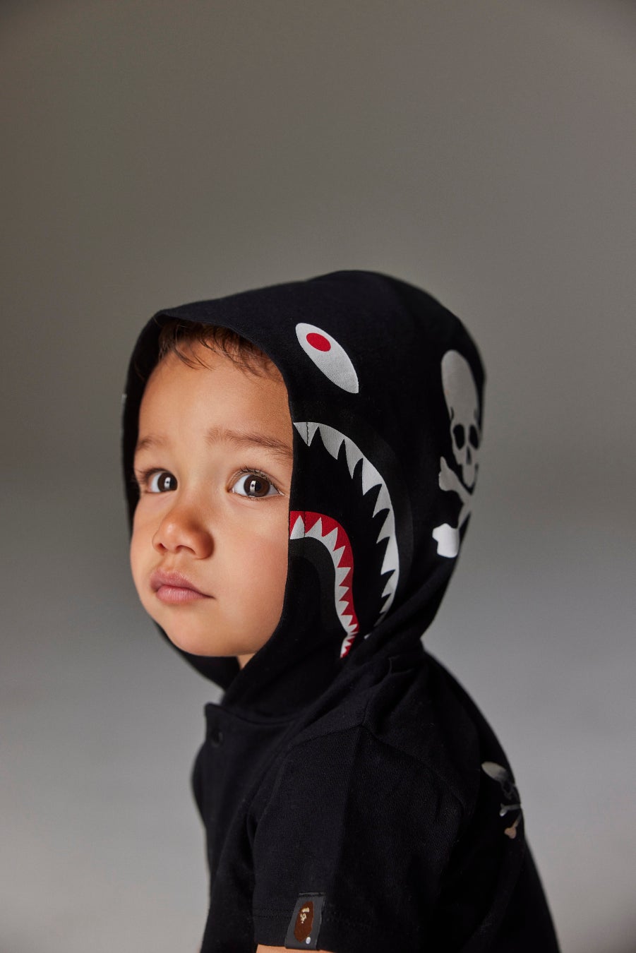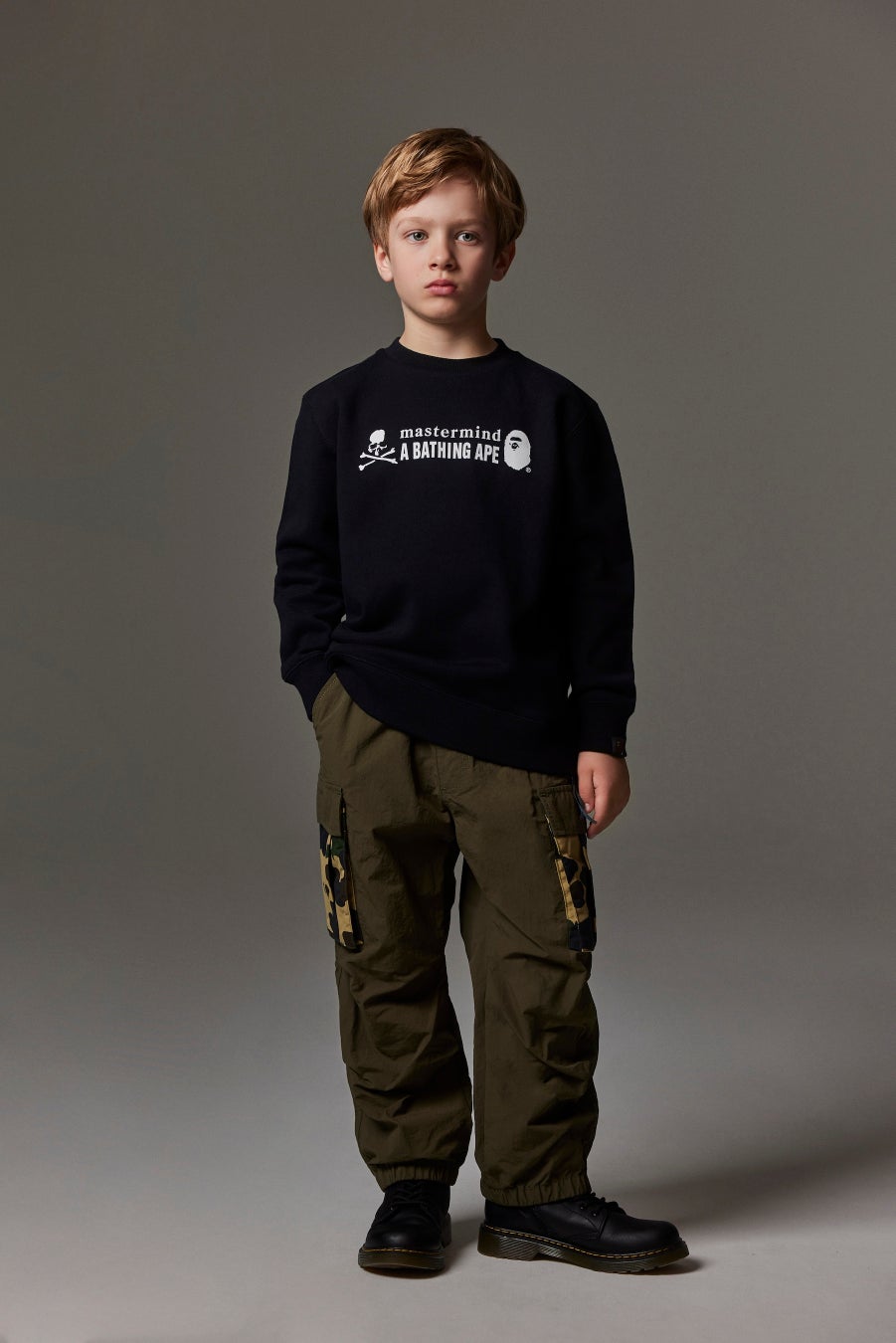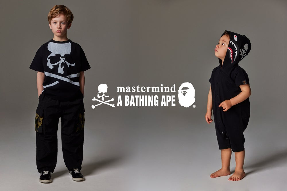 「mastermind JAPAN」のクロスボーンスカルや「BAPE®︎」のAPE HEAD、SHARKといった両ブランドのアイコンを存分に採用し、大人顔負けのアイテムをそろえました。