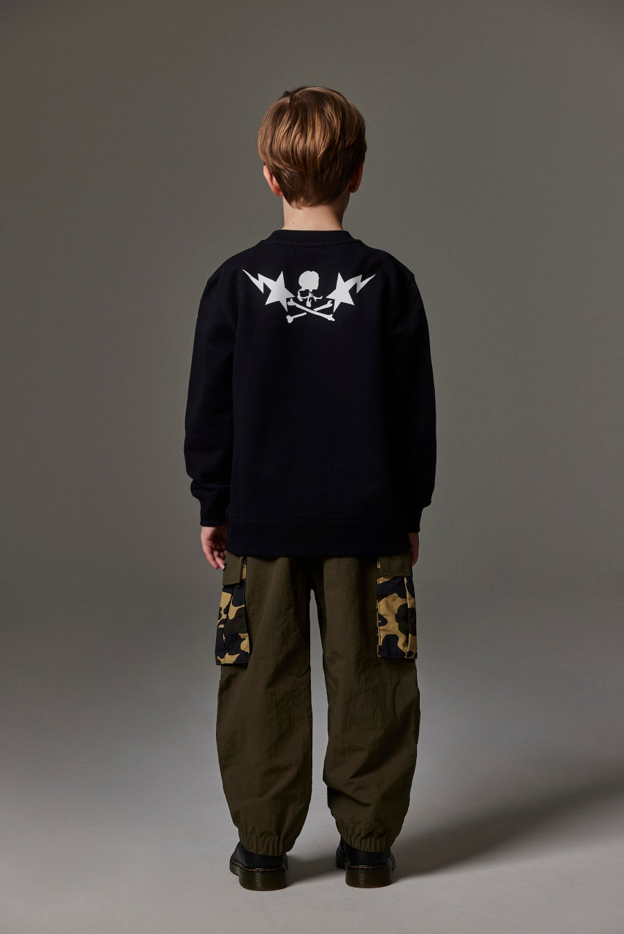 ブラックのクルーネックスウェットには、フロントに“mastermind A BATHING APE®︎”をプリント。バックには、クロスボーンスカルとSTAを組み合わせたお馴染みのコラボロゴをプリントしました。