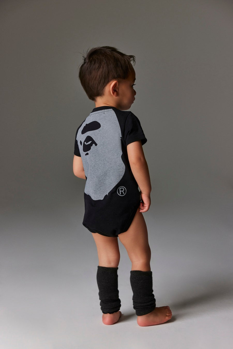 また、頭からかぶるタイプのボディスーツは、フロントにクロスボーンスカル、バックにAPE HEADを大きくプリントしたデザイン。ブラックのボディに、ホワイトとグレーでプリントした2色展開。