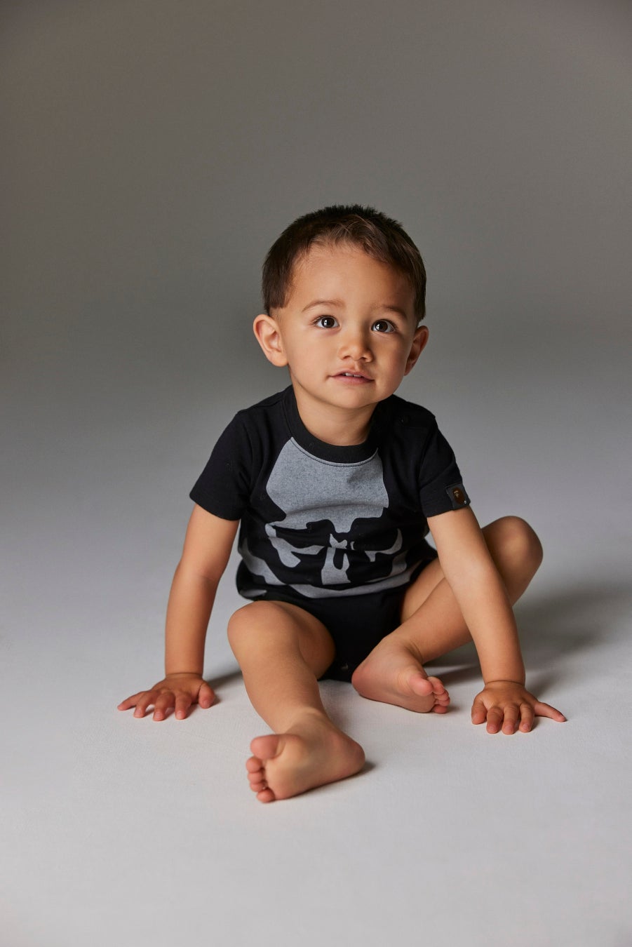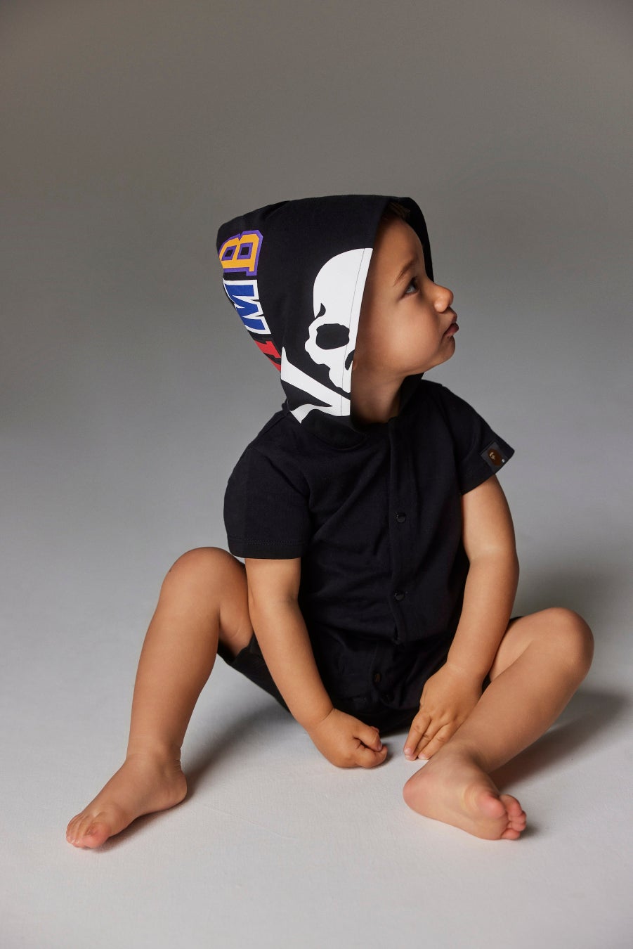「BAPE®︎」のシグネチャーピース「SHARK HOODIE」からインスピレーションを得たブラックのフード付きロンパースは、フード部分にクロスボーンスカルとSHARKをプリントしました。