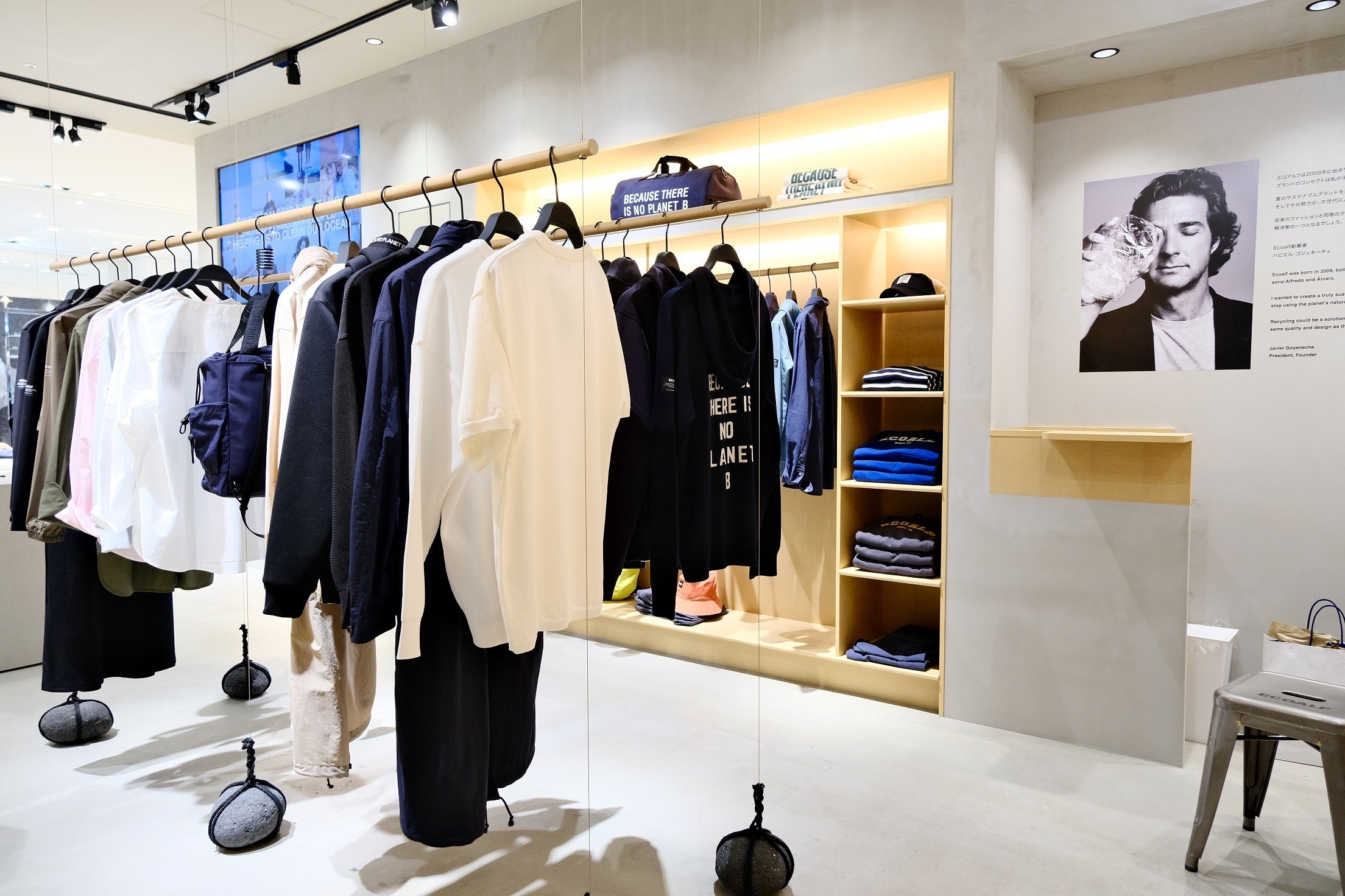 「ECOALF」は異業種の企業や行政機関と協力することで、環境問題に向き合うための啓発活動や新たな資源活用・循環の創出を模索しており、「ECOALF 新宿髙島屋」では、店装においても異業種の3社のパートナー企業の協力を得ることで、資源活用や環境問題に向き合うことを訴求する店舗となっています。