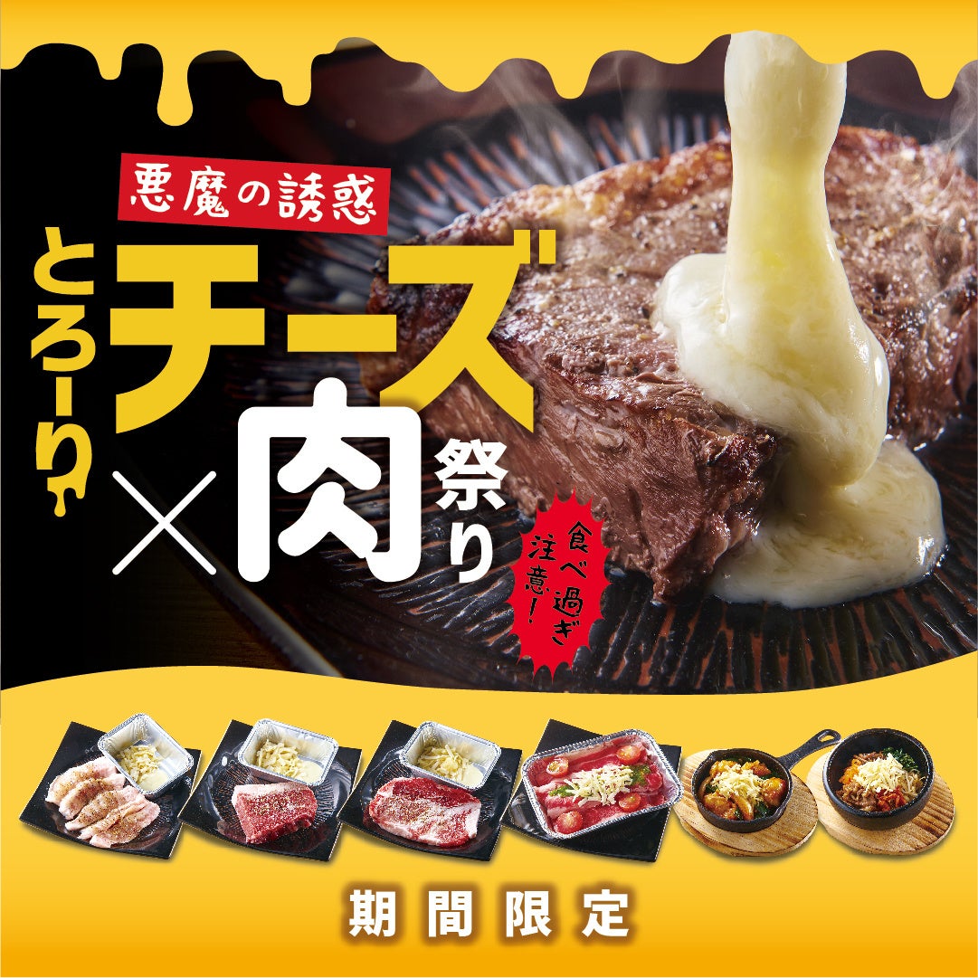「とろ~りチーズ×肉祭り」でご提供させていただく「チーズ×トマト焼きすき」「ガーリックチーズ×イベリコ豚」「ハニーチーズ×トントロ」「チーズ×サーモンカルパッチョ」「チーズ×ビビンパ」「旨辛チーズ×ホルモン」「チーズ×激辛韓国B級グルメ ラッポッキ」「ハニーチーズ×ひと口アイスキャンディ」の8種は全ての食べ放題コースでご注文が可能で、それらに加え「肉ベンジャーズコース」「和牛マニアコース」をご注文のお客様は「トリュフ香るチーズ×サーロインステーキ」も食べ放題として加わった9種のバラエティ豊かな商品をお楽しみいただけます。もちろんすべての商品は単品でのご注文も可能です。