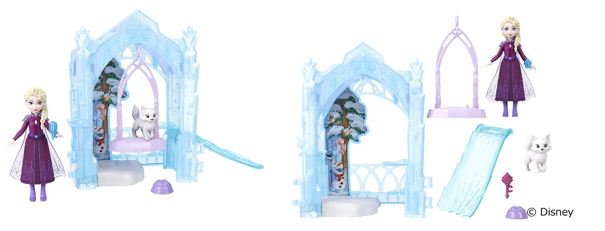 「エルサのこおりのひみつきち」は、映画に登場する幻想的なロケーションをイメージしたプレイセットです。氷に包まれたひみつきちの中には、ブランコや氷の噴水をはじめ、エルサのミニドールや白いキツネのフィギュア、物語遊びを広げるアクセサリーがそろっています。