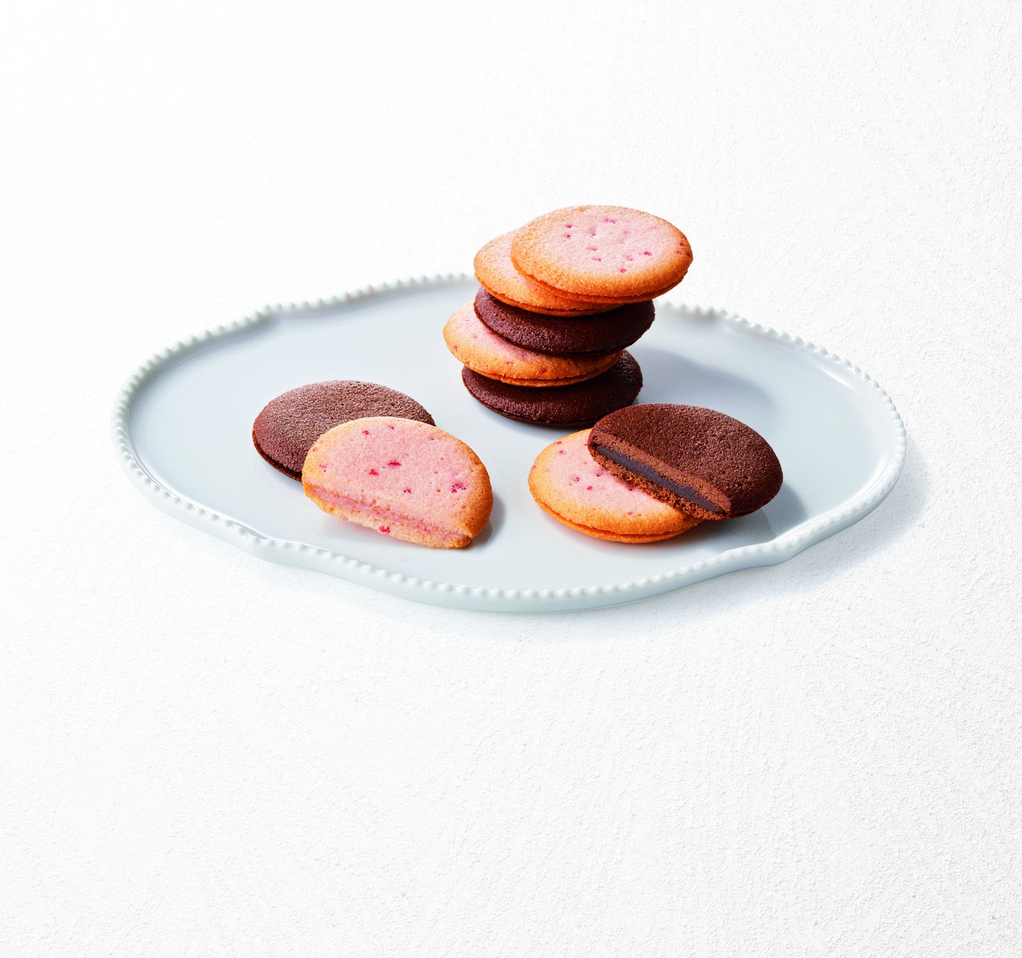 パッケージは、京都国立近代美術館に所蔵されているプリント服地見本[あじさい]の限定デザインで、「あまおう苺&ホワイトチョコレート」と「ダークチョコレート」の2種類のラングドシャクッキーを詰め合わせました。またパッケージに描かれた作品をさらに楽しんでいただけるよう、作品の簡単な解説を添えたカードも同封しています。