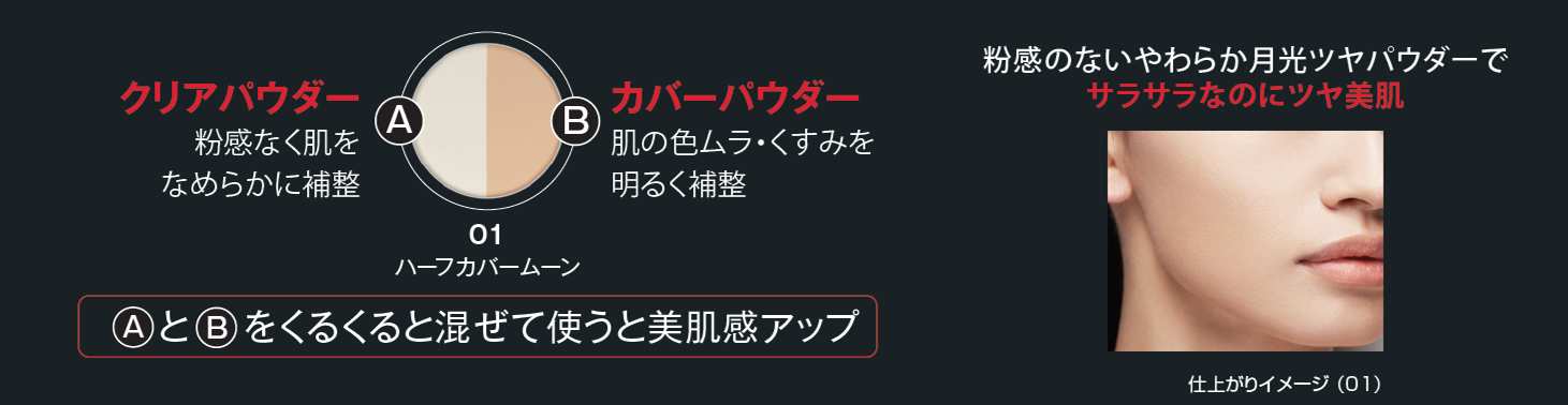 「ケイト ムーンプレストブライトパウダー限定セットⅡ」には、クリアパウダーとカバーパウダーの2つのパウダーがセットされています。クリアパウダーは粉感なく肌をなめらかに補整。カバーパウダーは肌の色ムラ・くすみを明るく補整します。肌悩みや仕上がりイメージによって2つのパウダーを使い分けるなど、使い方は自由自在。厚塗り感なく、メイク直しにもおすすめです。