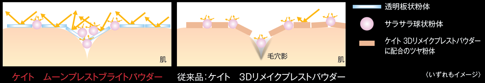透明板状粉体は、従来ケイトで使用しているツヤ粉体よりも薄くて光を通しやすい。また、粒径も大きく光を強く反射するため、透明度の高いツヤ感を実現できる。