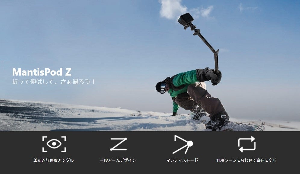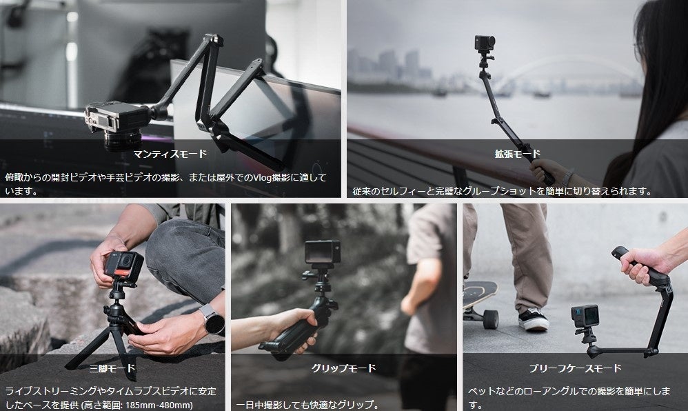 アクションカメラやスマートフォン、ミラーレス一眼カメラが搭載可能で、3段に折りたためる設計やボールヘッド構造により、アームを延長した自撮りから、卓上での撮影、マンティスモードで俯瞰からのショットなど多様なアングルでの撮影を可能にします。