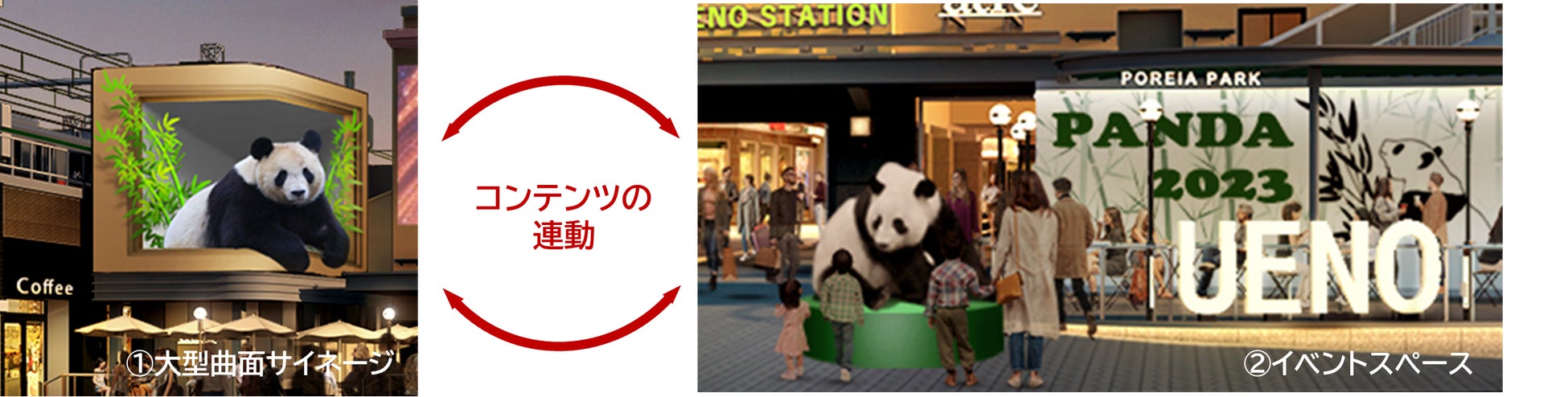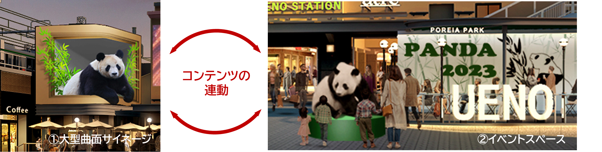 大型曲面サイネージで放映される立体的(3D)コンテンツと連動し、イベントスペースではお客さま参加型のイベント・催事展開やオブジェ設置など、各種技術と企画の連動により、広場で一体的な体験を演出します。