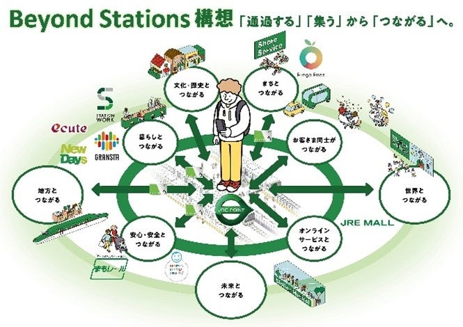 ヒトの生活における「豊かさ」を起点として、リアルの交流拠点である駅の強みを活かしながら駅空間の配置と機能を変革するとともに、JRE POINT生活圏の拡充を通じ、駅を「交通の拠点」から「暮らしのプラットフォーム」へと転換します。