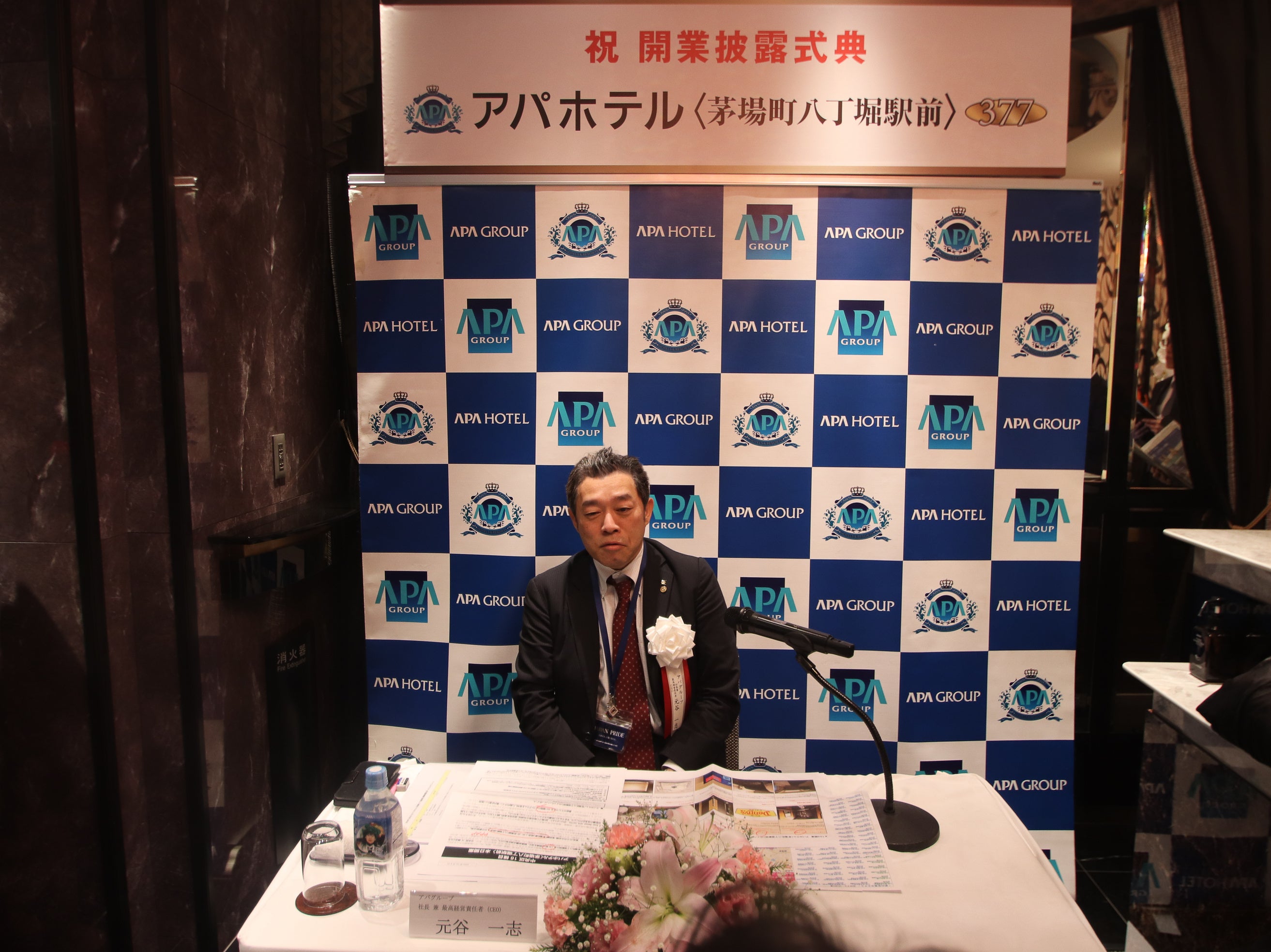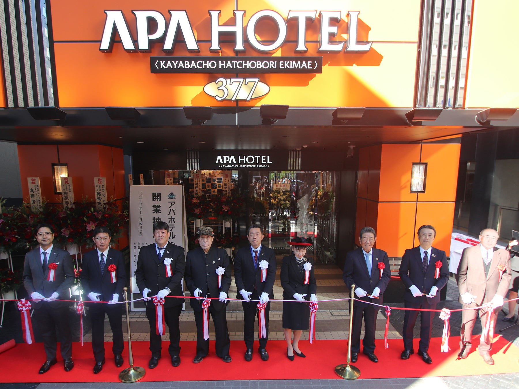記者発表では、アパグループ社長 兼 最高経営責任者(CEO)元谷 一志は「当ホテルは中央区16棟目のアパホテルであり、先月開業したアパホテル〈八丁堀駅前〉に続き八丁堀エリアで2棟連続での開業となる。八丁堀エリアは『舞浜駅』や都内の観光地へアクセス至便であることから特に訪日外国人客に人気の高いエリアの1つであり、当ホテルにおいても高稼働を期待している。当社はコロナ禍中においてもアフターコロナを見据えた新規ホテルの開業や既存ホテルのリニューアルを計画通り進めた結果、前年度の売上と比較して好調に推移している。また、ホテルの拡大と並行して社員の健康管理にも注力しており、12月1日より人間ドックの対象年齢を役職に応じて引き下げたほか、設置型社食サービス『OFFICE DE YASAI オフィスでごはんプラン』を全ホテルに導入予定など健康経営を意識した福利厚生制度の拡充を進めている。アパホテルは『Even Better! APA HOTEL』を標榜し、お客様のご意見やアイデアを取り入れながら常に進化し続けている。より一層利便性が高く、満足度の高いホテルへと今後も進化を遂げながら、さらなる拡大戦略を図っていきたい。」と述べた。