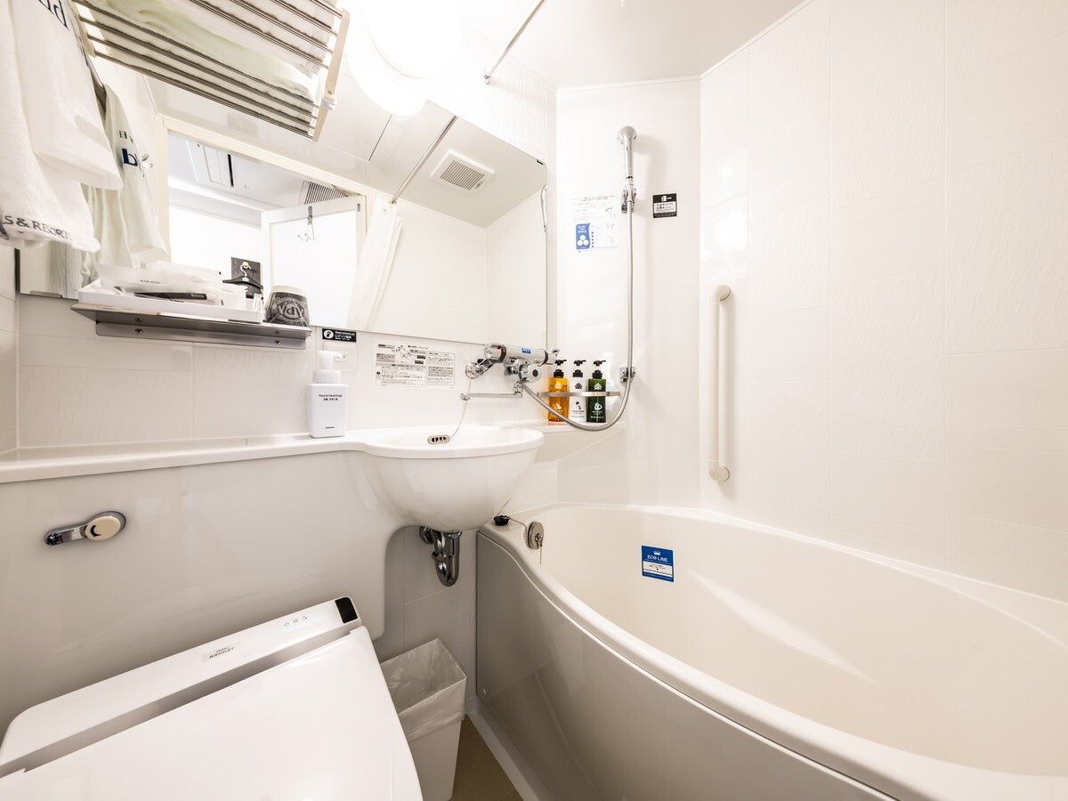 客室標準仕様 | ① 50型以上大型液晶テレビ ② ホテルの館内案内などをテレビ画面に集約表示した『アパデジタルインフォメーション(ADI)』(ピクトグラムを使用した訪日外国人客にもわかりやすく、操作しやすいデザインへ一新) ③ 動画配信サービスを2タッチでスマホからテレビに映すことができる「キャスト機能」 ④ BBC NEWS無料放映(訪日外国人客に合わせ主音声を英語化) ⑤ 通信速度、接続の安定性、セキュリティ面に優れた次世代Wi-Fi規格「Wi-Fi6」無料接続可能 ⑥ 照明スイッチ類(おやすみスイッチ(GOOD NIGHTスイッチ)、空調リモコン、コンセント、USBポート、HDMI端子)を集約した枕元集中コントローラー ⑦ 明るさ・省エネ・意匠性を追求した高効率オリジナルLEDライン照明(新たに調光機能追加) ⑧ 仕様の異なる2種類のアパホテルオリジナル枕「PRIDE FIT(プライドフィット)」、「ADJUST FIT(アジャストフィット)」 ⑨ 寝具の「西川」と共同開発したアパホテルオリジナル羽毛ふとん「SOFT FIT(ソフトフィット)」 ⑩ 快眠性を維持・向上しながらも、従来のオリジナルベッドと比べ軽量化を図った「Cloud fit Grand(クラウドフィット グラン)」※ ⑪ 気中の花粉やカビ菌、ウイルスなどの抑制効果のあるパナソニック「高濃度のナノイーX」を搭載し、従来機より人にやさしい風の流れを追求したエアコン ⑫ 通常の浴槽より約20%節水可能かつ、ゆったり入浴できるオリジナルユニットバスを採用 (自社開発した節水タイプの卵型浴槽、サーモスタット付定量止水栓、節水シャワー)※ ⑬ ウルトラファインバブルシャワーヘッド「Bollina Wide Plus(ボリーナワイドプラス)」 ⑭ バイオマス原料や再生プラスチックを用いた環境へ配慮した客室アメニティ(歯ブラシ・ひげ剃り・ヘアブラシ・シャワーキャップ・ボディタオル) ⑮ ほぼ全世界のプラグに対応するユニバーサルコンセント ※一部客室除く |