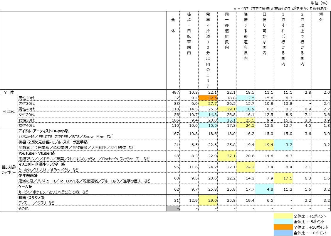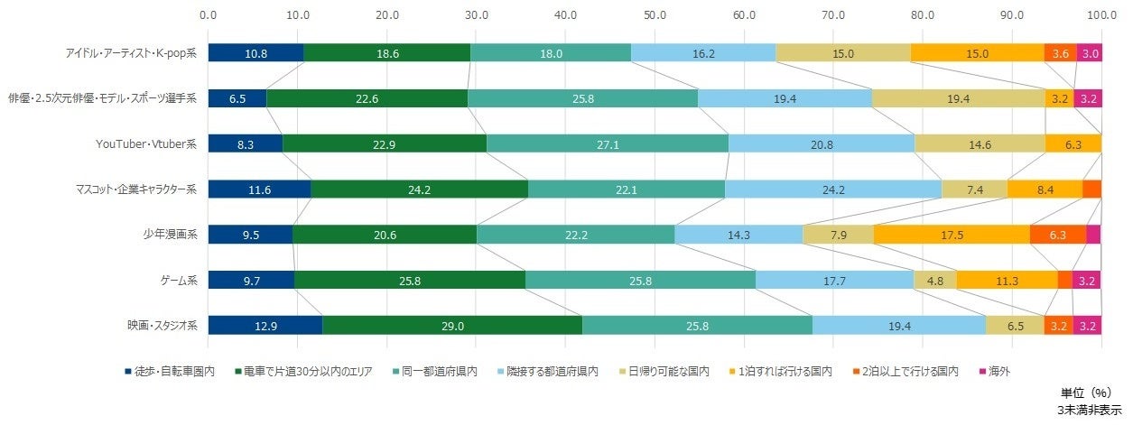また、各カテゴリーにおいて「どの距離感までで過半数(累計50%)を超えるか」を見ると、【アイドル・アーティスト・K-pop系】以外は「同一都道府県内」で過半数を超えた。