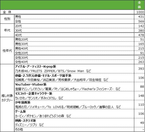 本調査では、現在推し活を行っており、かつ最推し対象が以下カテゴリーに該当する20~40代の男女を対象としています。