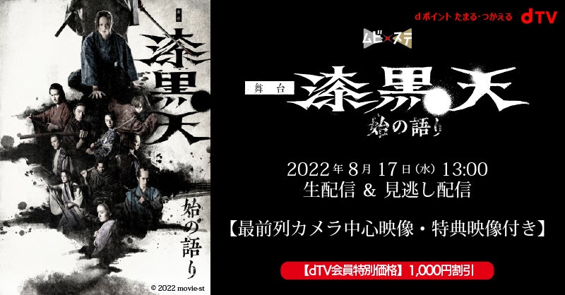 映像配信サービス「dTV®」は、「ムビ×ステ 舞台『漆黒天 -始の語り-』」2022年8月17日(水)13:00公演を【最前列カメラ中心映像・特典映像付き】にて生配信します。dTV会員なら特別に、通常価格から1,000円割引の3,400円で視聴チケットを購入可能です。