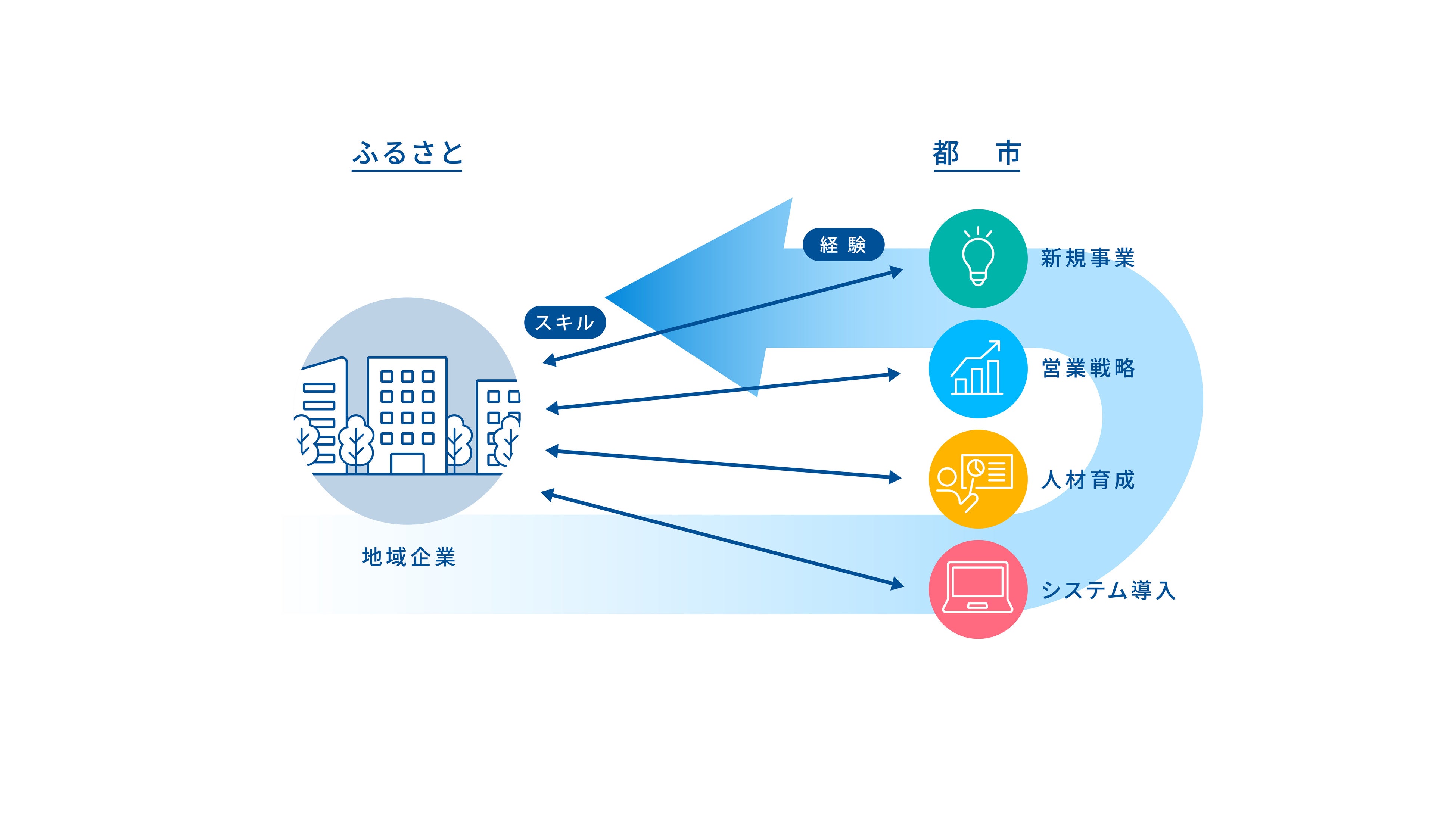 「スキルリターン」とは、都市部ではたらきながらも、「地方を発展させたい」「この企業の可能性を信じている」といった想いを持ったプロ人材のスキルを“ふるさと”に還元(リターン)する取り組みを示しています。