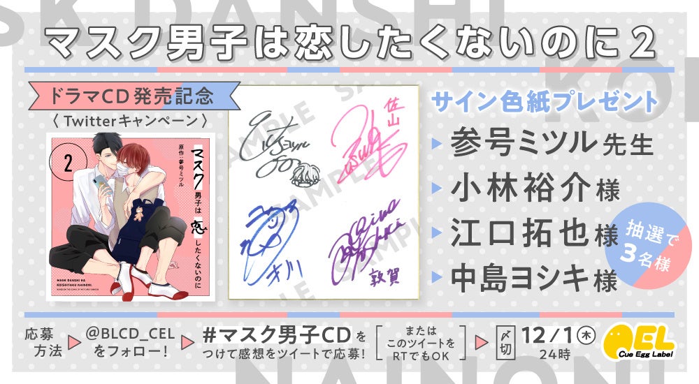 ドラマCD「マスク男子は恋したくないのに2」明日11月18日発売! 出演は小林裕介さん、江口拓也さん、中島ヨシキさん! サイン色紙が当たる★Twitterキャンペーンの開催も決定♪