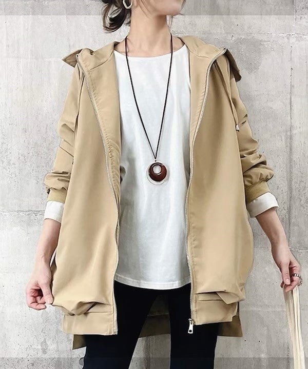 ハリのある生地と絶妙な丈感で体型カバー&大きめフードで小顔効果も狙える、大人可愛いマウンテンパーカー。