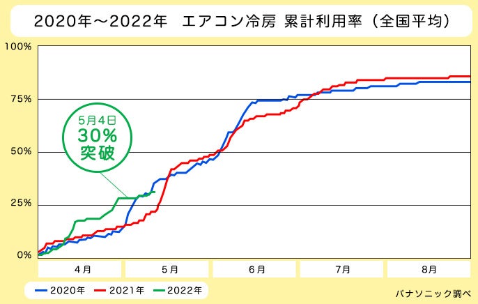 今年は5月4日に累計利用率30%を突破。2020年は5月8日、2021年は5月15日にそれぞれ30%に到達しており、今年は過去3年で最も早く、3割のユーザーがエアコン冷房を利用開始したことが判明しました。