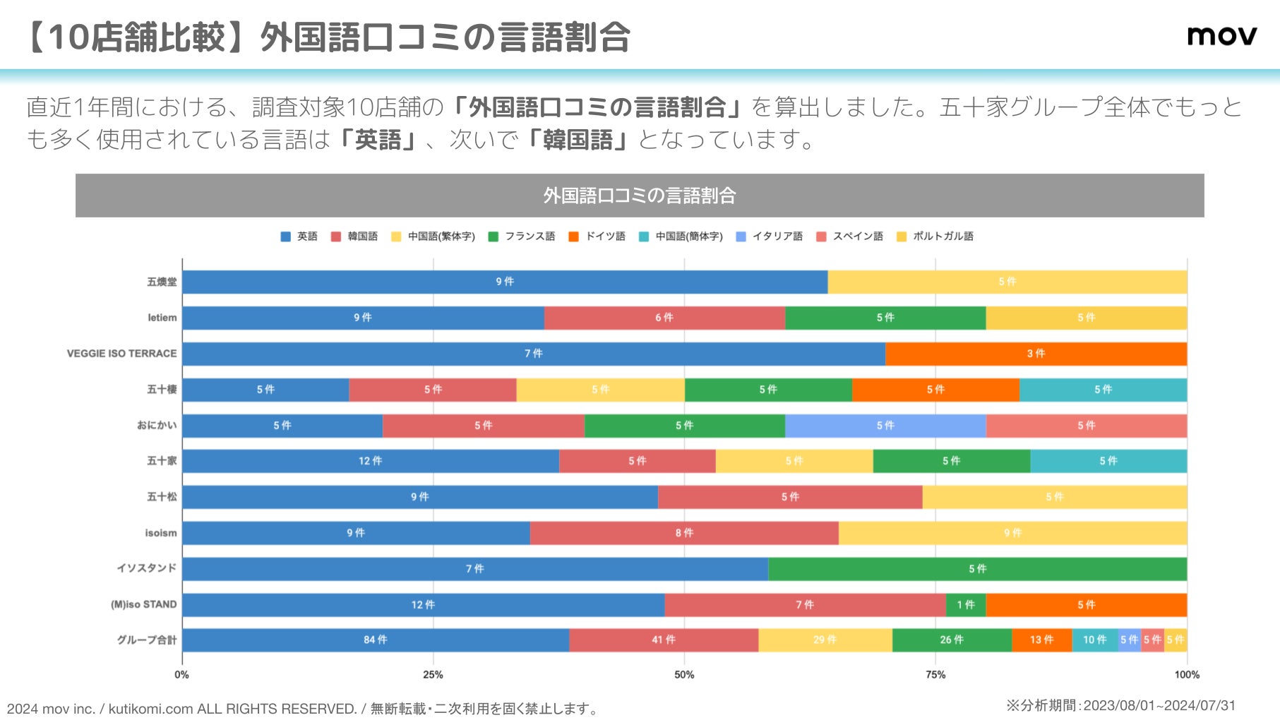 こちらのグラフでは、直近1年間における、調査対象10店舗の「外国語口コミの言語割合」を算出しています。五十家グループ全体でもっとも多く使用されている言語は「英語」、次いで「韓国語」となっています。