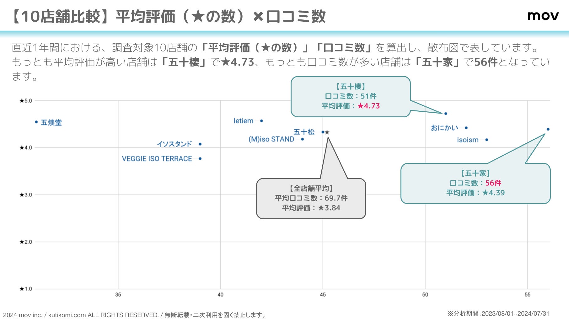 こちらの散布図では、直近1年間における、調査対象10店舗の「平均評価(★の数)」「口コミ数」を算出しています。もっとも平均評価が高い店舗は「五十棲」で★4.73、もっとも口コミ数が多い店舗は「五十家」で56件となっています。