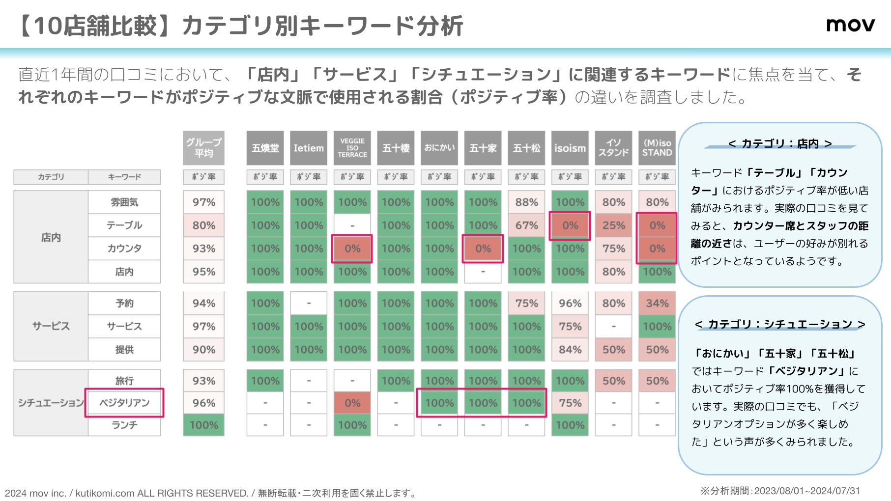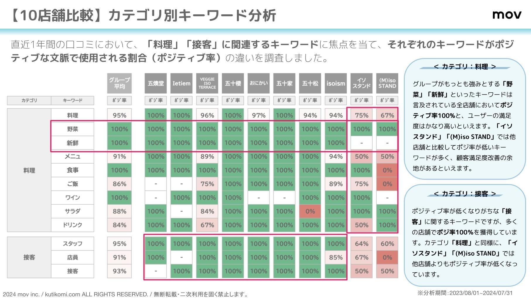 グループがもっとも強みとする「野菜」「新鮮」といったキーワードは言及されている全店舗においてポジティブ率100%と、ユーザーの満足度はかなり高いといえます。「イソスタンド」「(M)iso STAND」では他店舗と比較してポジティブ率が低いキーワードが多く、顧客満足度改善の余地があるといえます。