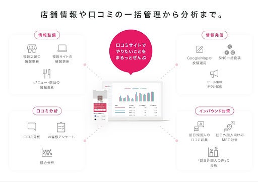 口コミコムは、国内外の口コミサイトを”もっと”売上に変える「口コミサイトの一括管理ツール」です。口コミの情報を活かした店舗改善やGoogleマップ・口コミサイトからの集客数増加を支援します。