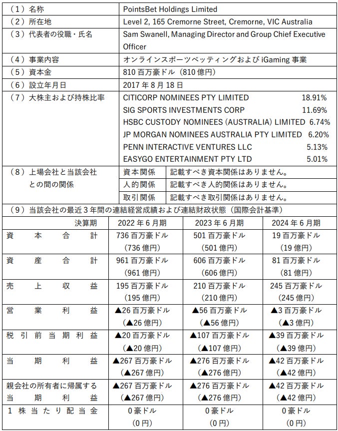 株式会社MIXI(東京都渋谷区、代表取締役社長 上級執行役員 CEO:木村 弘毅)は、2025年2月25日付の取締役会において、新設した完全子会社であるMIXI Australia Pty Ltd(以下「MIXI Australia」)を通じて、主としてオーストラリアやカナダでベッティング事業を行うオーストラリア証券取引所に上場するPointsBet Holdings Limited(以下「PointsBet」)の発行済株式の 100%を取得(以下「本件株式取得」)し、完全子会社化することについて決議いたしましたので、お知らせいたします。
