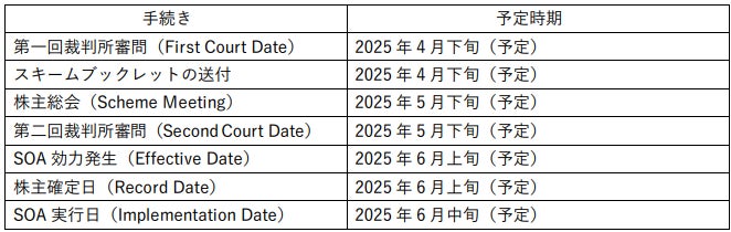 (注)上記日程は、オーストラリア証券投資委員会との協議やオーストラリア外国投資審査委員会による審査状況およびオーストラリア裁判所との日程調整に従い、関係当事者間で協議の上、変更されることがあります。