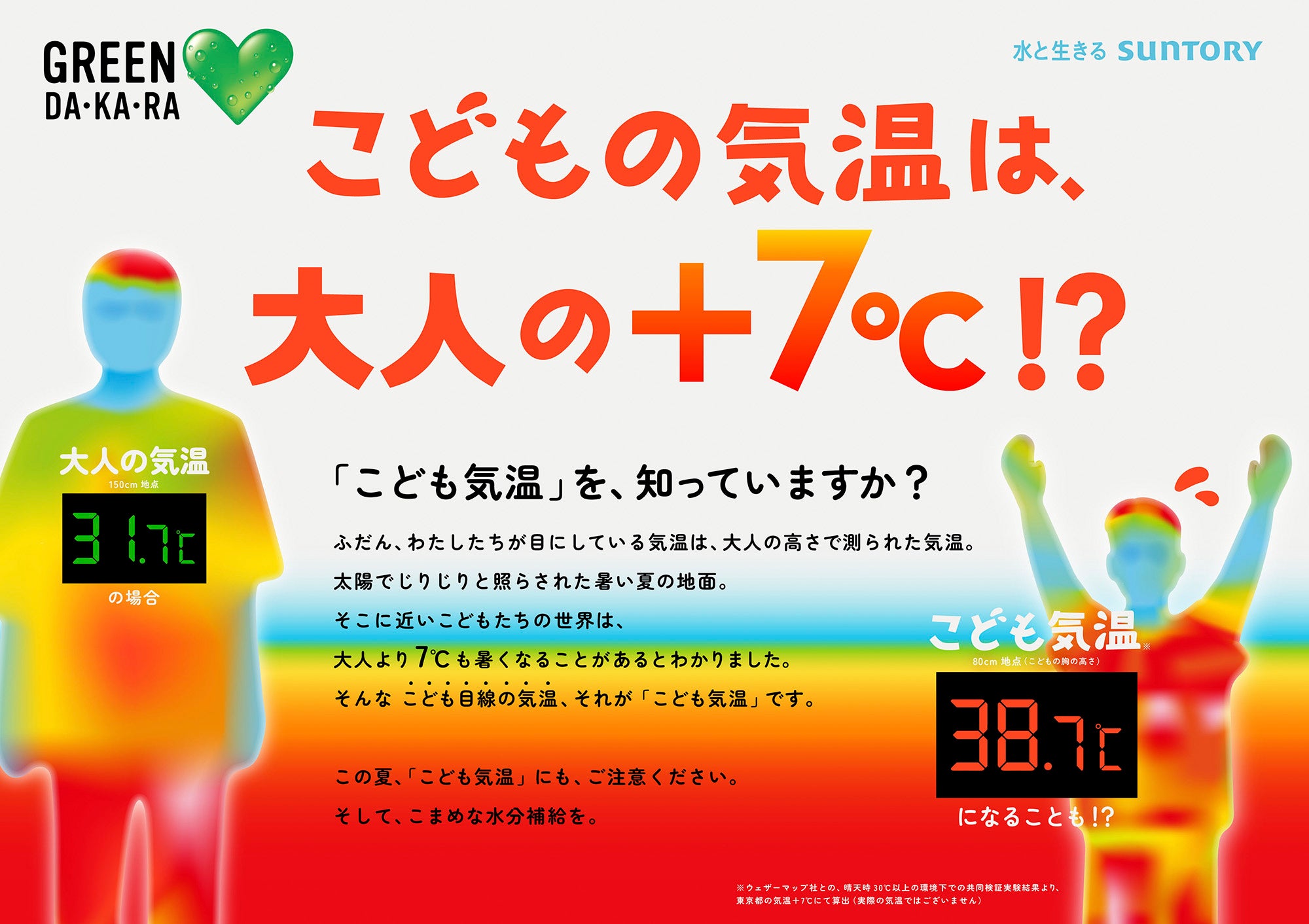 昨年、気象専門会社の株式会社ウェザーマップとの共同検証実験から、地面の照り返しの影響の差などにより、子どもの身長の高さで計測した気温が大人と比較して+7℃程度になることを確認しました。この子ども特有の暑熱環境を「こども気温」と称し、2023年7月に、熱中症対策啓発活動の一環として、啓発イベントや一部スーパーの店頭での告知などを実施しました。(https://www.suntory.co.jp/softdrink/news/pr/article/SBF1397.html参照)