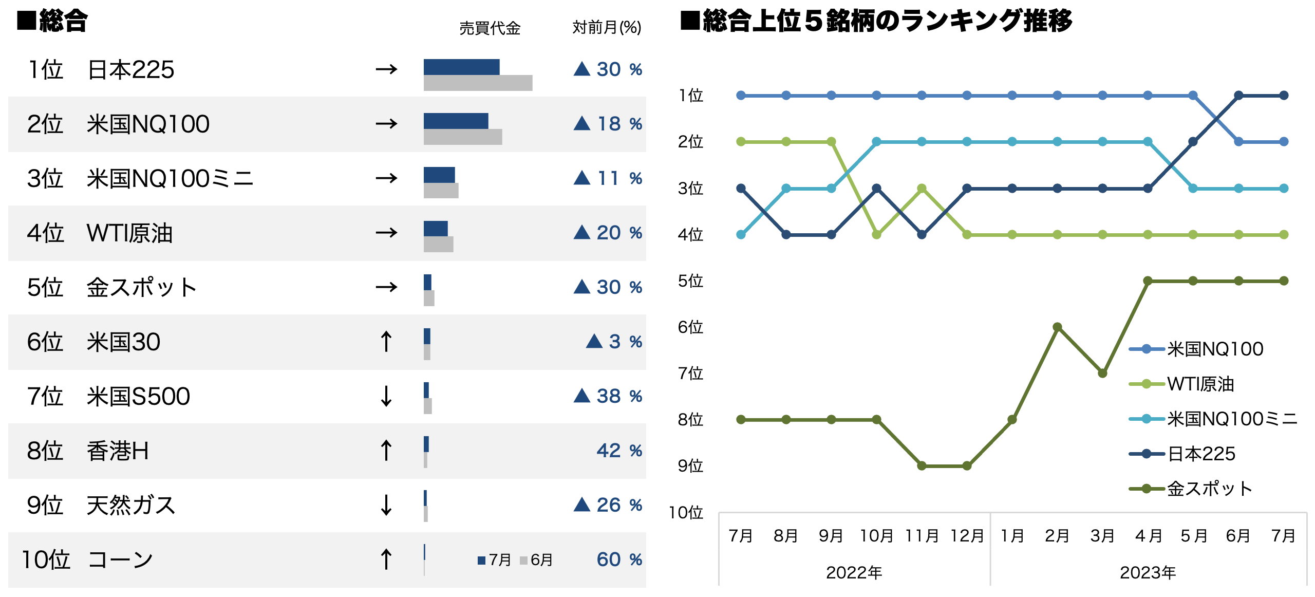 2023年7月のCFD売買代金ランキングは、日経平均株価が33年ぶりの高値更新後に続落し、その後再び上昇傾向に転じるなどボラティリティの高い相場展開となったことから、6月に続いて「日本225」が総合ランキング首位となりました。また、コーン先物の価格が急落したことを受けて、同先物を参照原資産とする「コーン」が2年ぶりに総合ランキングのトップ10にランクインしました。