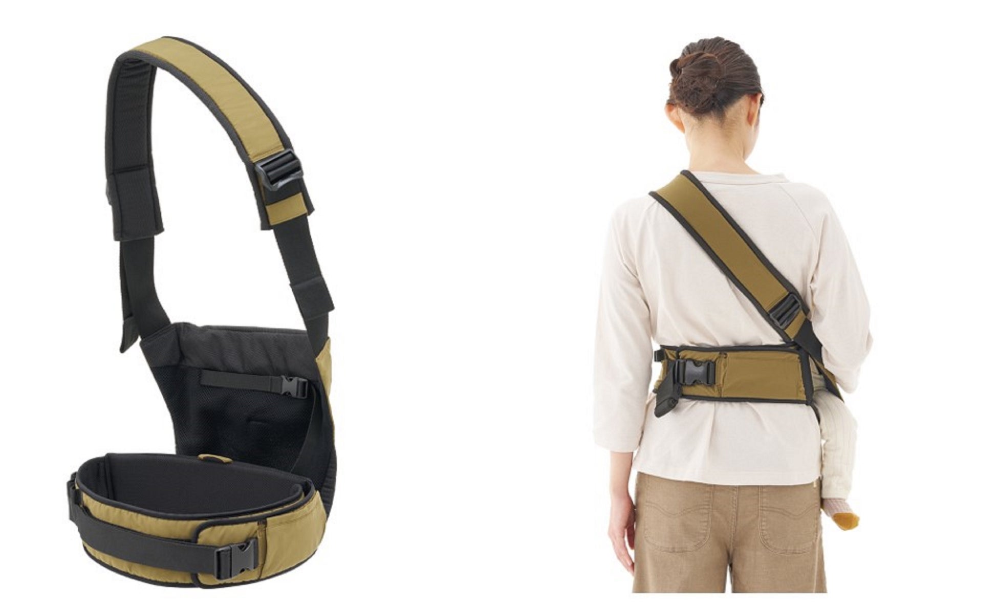 「ショルダーベルトとウエストベルトの2本の長さを調節するだけで、ユニセックスで使用できます。荷物が多い時の移動も、腰抱っこで足元をしっかり確保できます。」