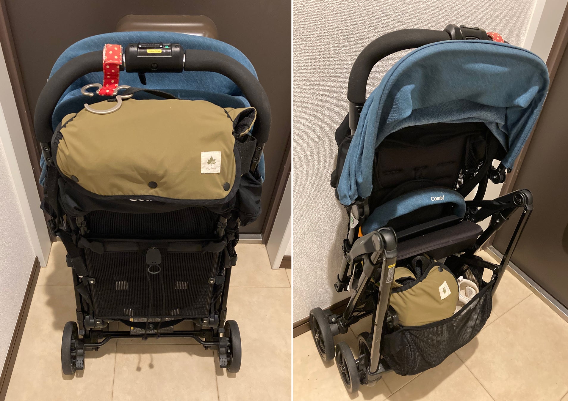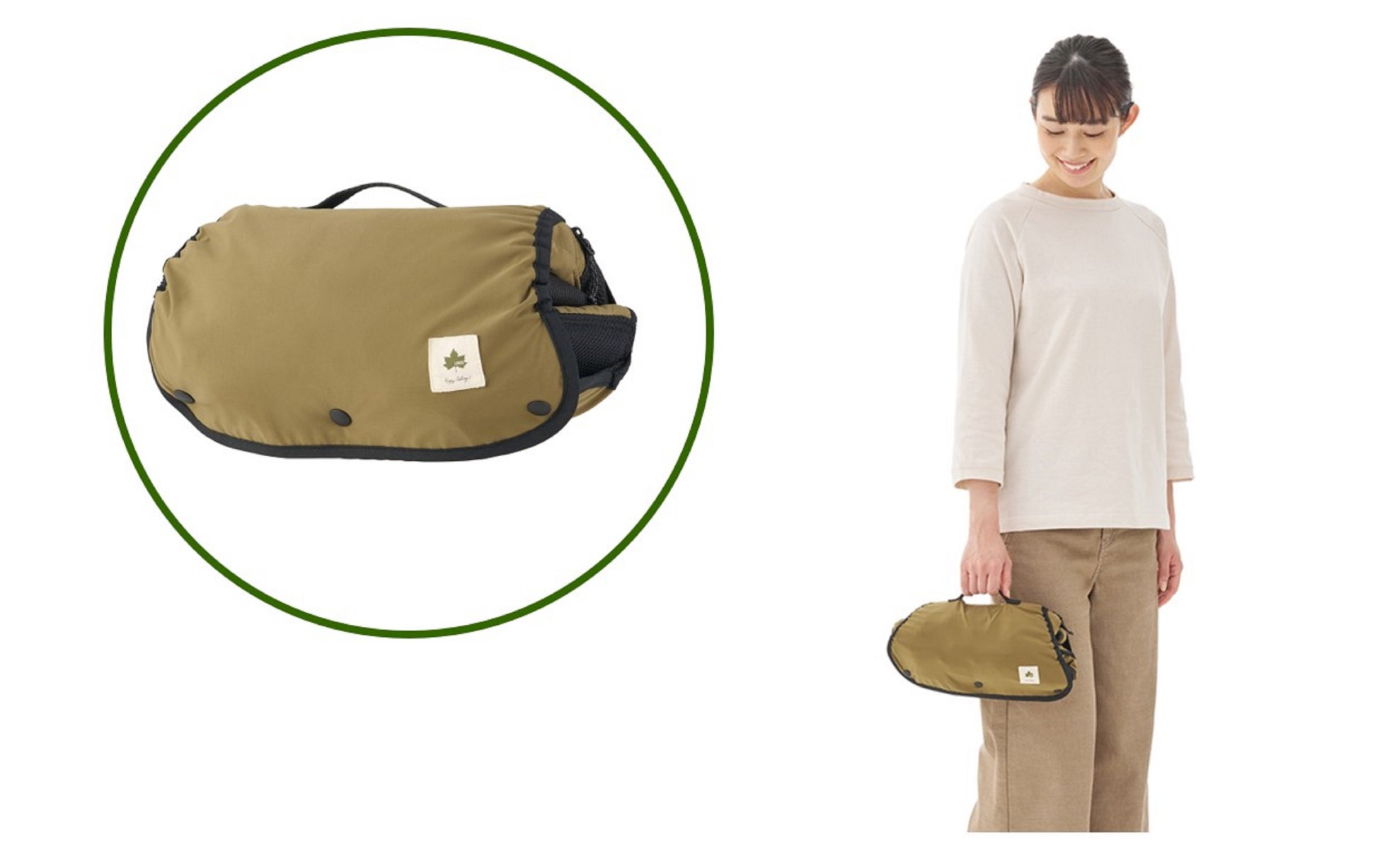 「収納袋不要で、まとめるだけで持ち運びが可能です。保育園のロッカーやベビーカーにすっぽり収まるサイズになるので、使用しないときも邪魔になりません。」