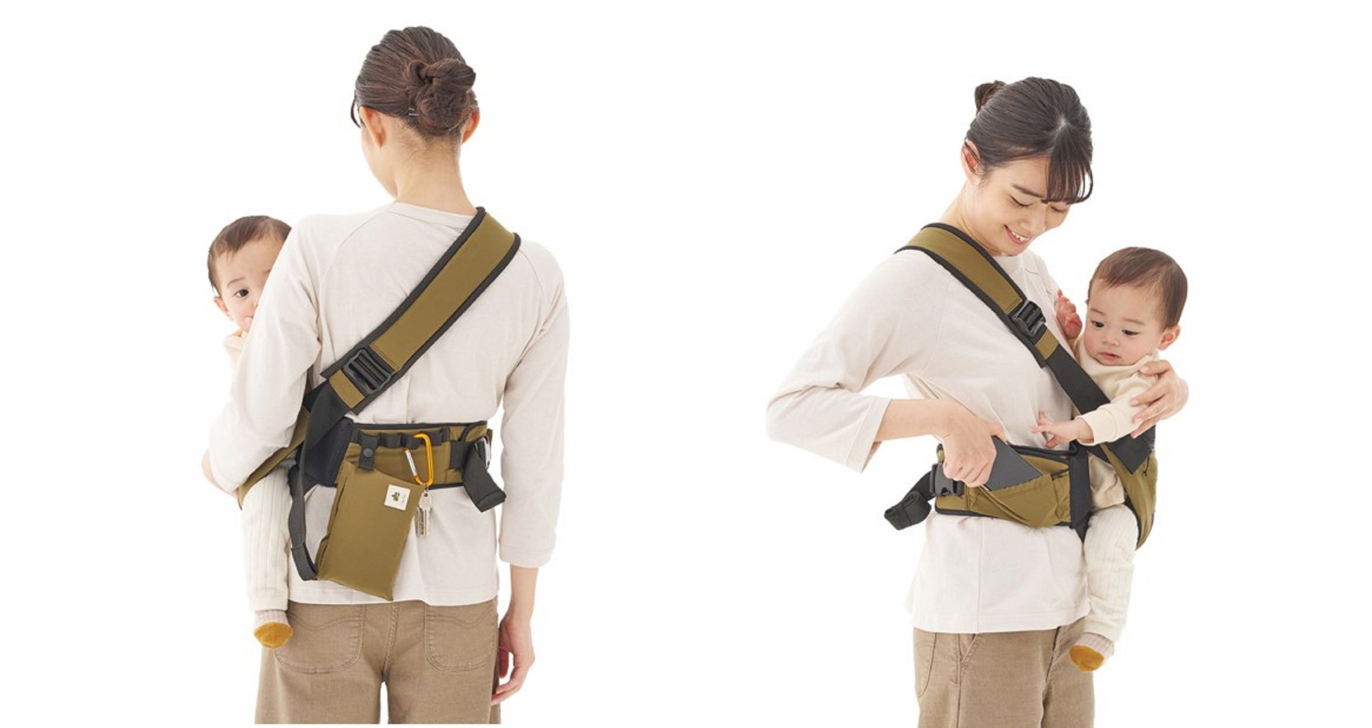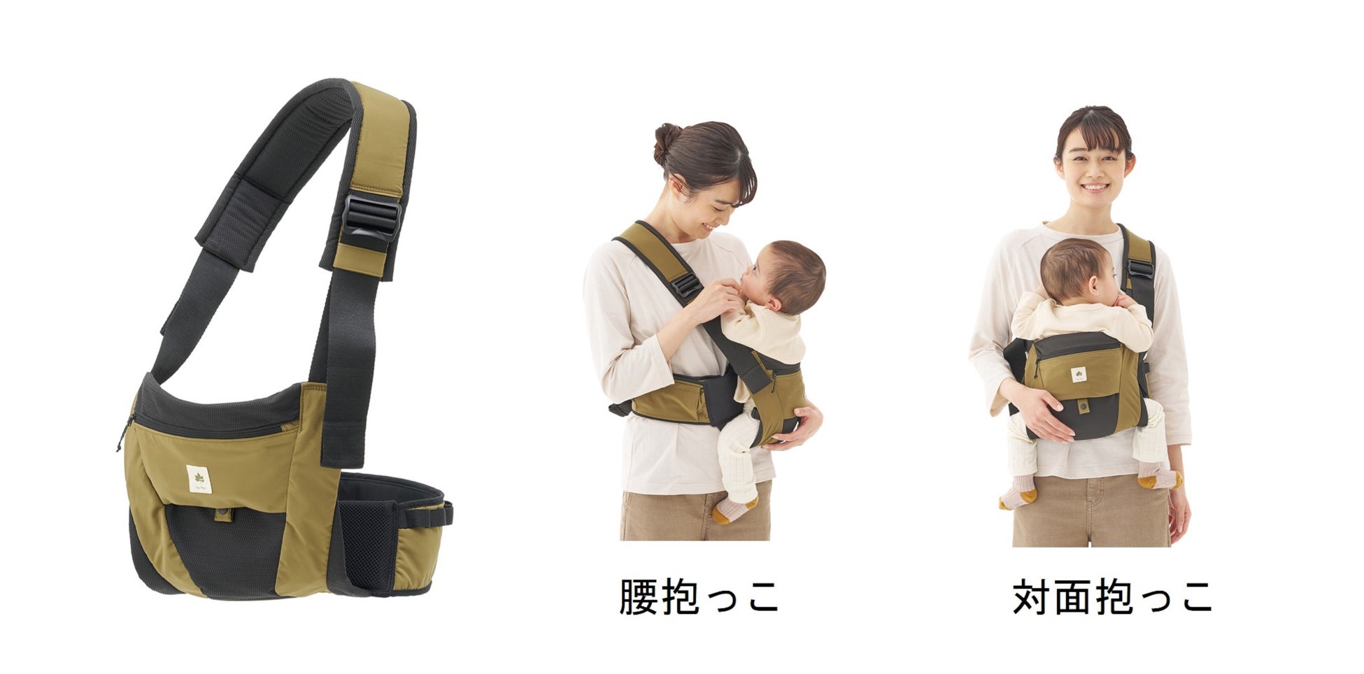 シーンに合わせて腰抱っこと対面抱っこの2通りの抱き方が可能。腰抱っこなら、赤ちゃんが前も見やすく同じ目線で一緒に楽しめ、アイコンタクトもスムーズ。