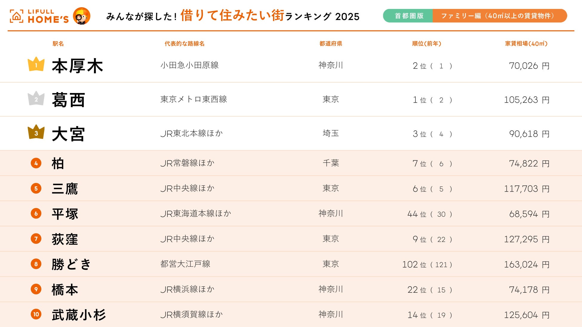 <首都圏版・ファミリー編>2025年 LIFULL HOME'S みんなが探した!住みたい街ランキング
