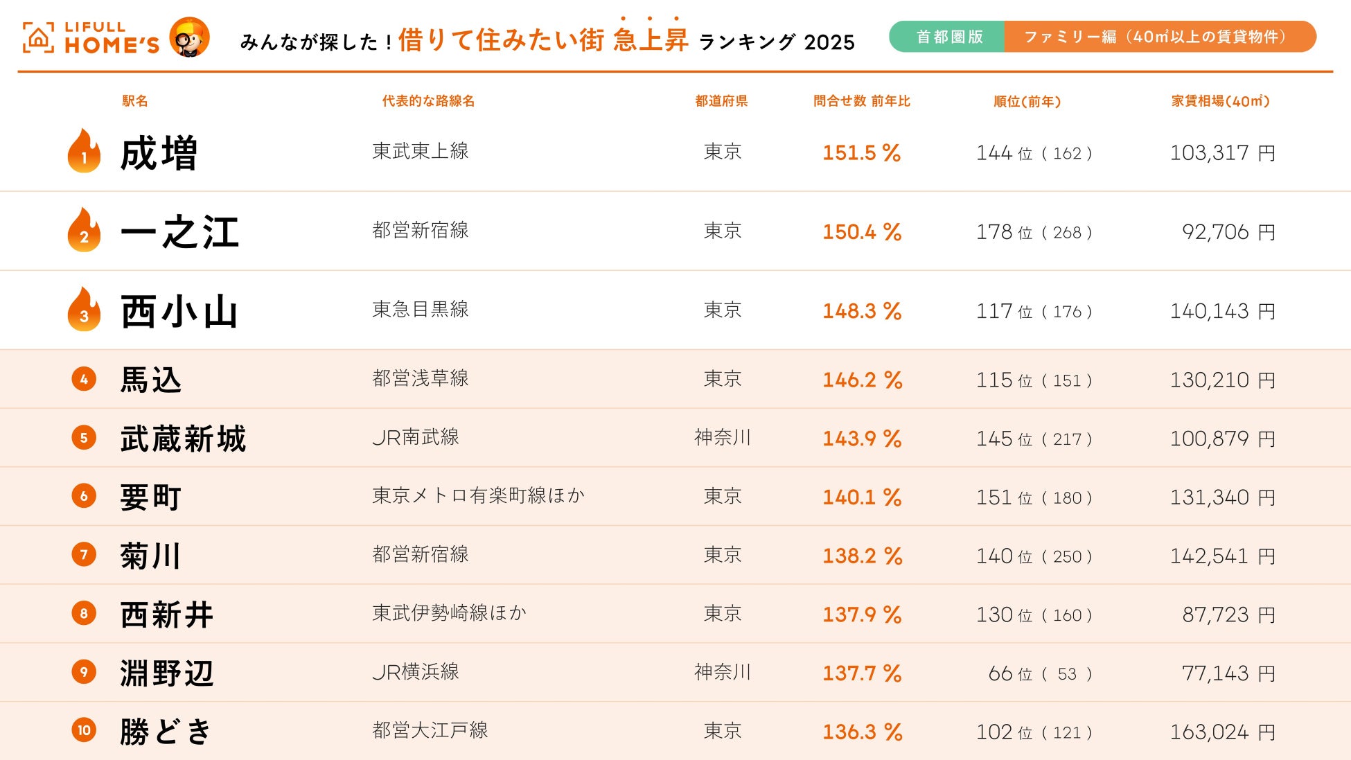 前年から問合せ数を伸ばした駅をランキングする「急上昇ランキング」。「2025年 LIFULL HOME'S みんなが探した!借りて住みたい街 急上昇ランキング(首都圏版・ファミリー編)」の1位は「成増」、2位は「一之江」、3位は「西小山」となりました。