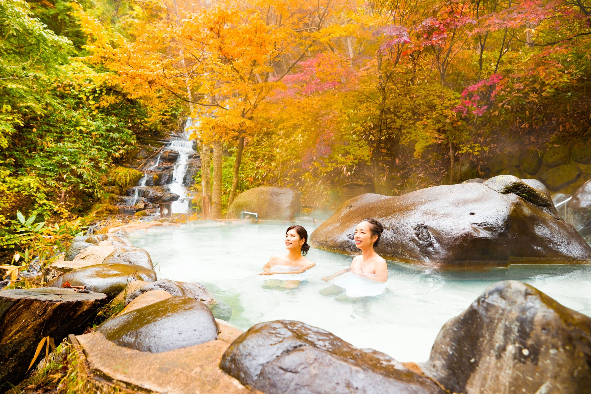 本サービスでは、1日1組限定で、露天風呂「八重九重(やえここのえ)の湯」を貸し切りで利用できます。八重九重の湯は、色鮮やかで美しい紅葉の景色が広がる、野趣あふれる絶景露天風呂です。色鮮やかな紅葉と、高さ約7mの滝を目の前に望み、水のせせらぎ、木々のそよぎ、野鳥の鳴き声など、全身で大自然を感じることができます。湯の花が広がるたっぷりの温泉に浸かりながら、紅葉を独り占めする時間は、都会では味わえない至福のひとときです。